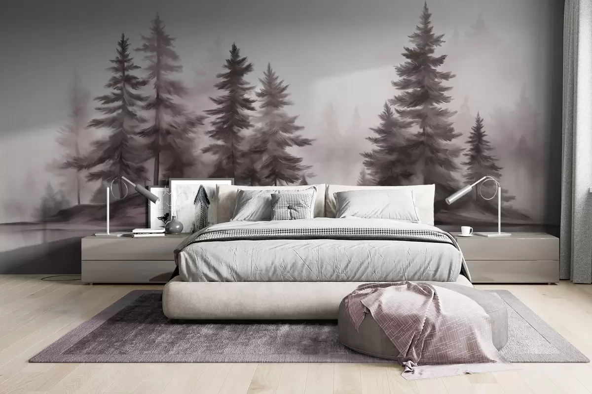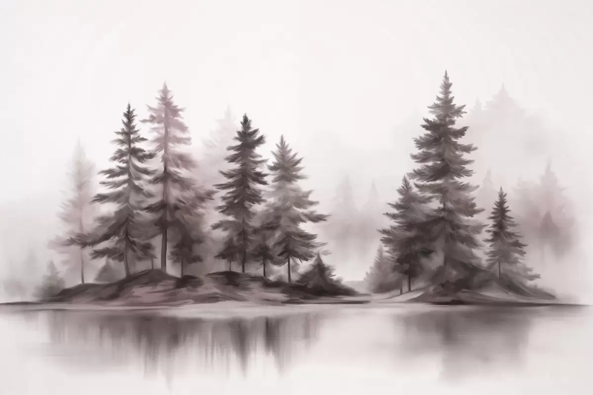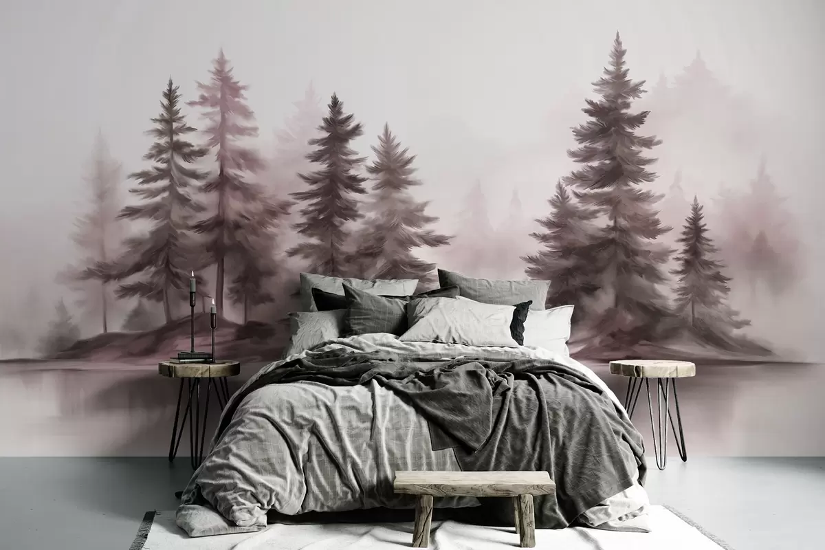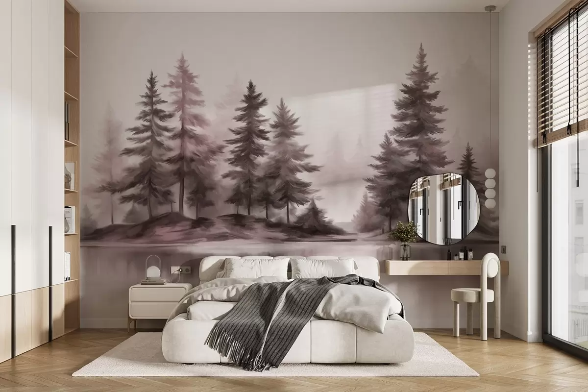 Papel de pared Un bosque brumoso con textura y altos pinos pintados de imitación. Nr. w09610v1