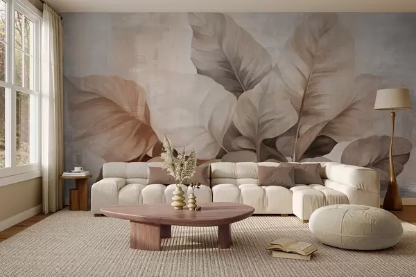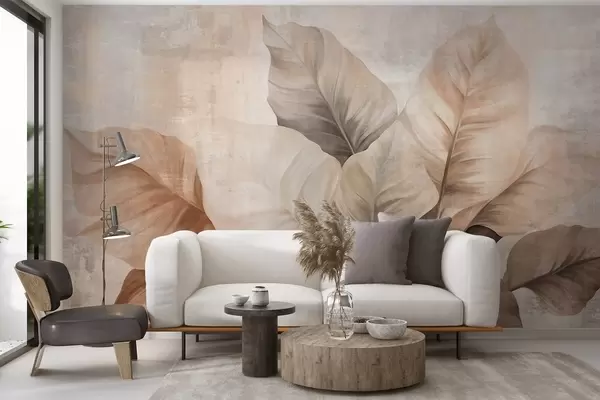 Papel de pared Imitacione de pintura texturizada de hojas grandes de color marrón claro sobre un fondo neutro con pinceladas sutiles. Nr. w09614