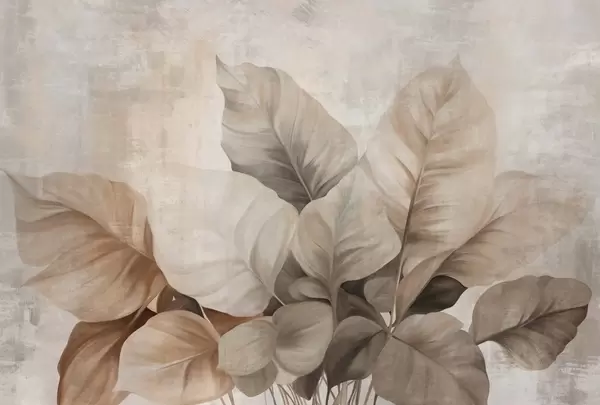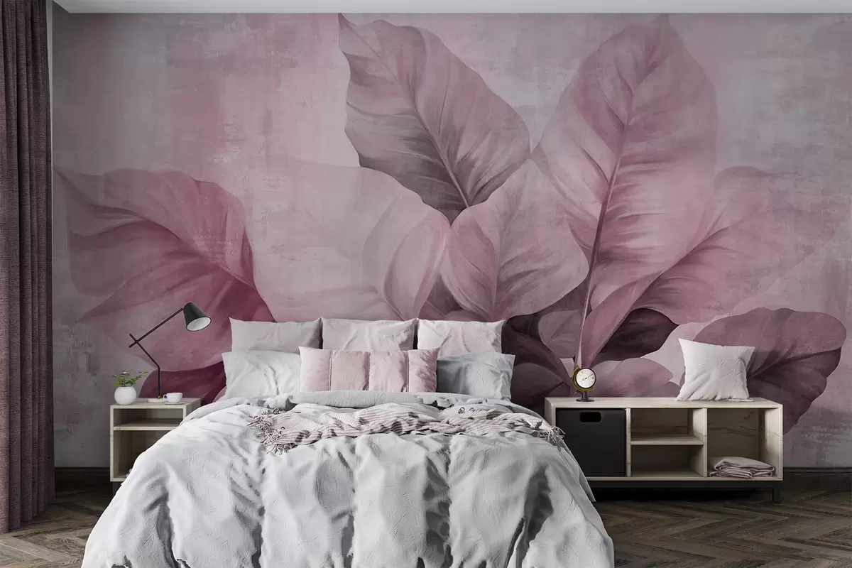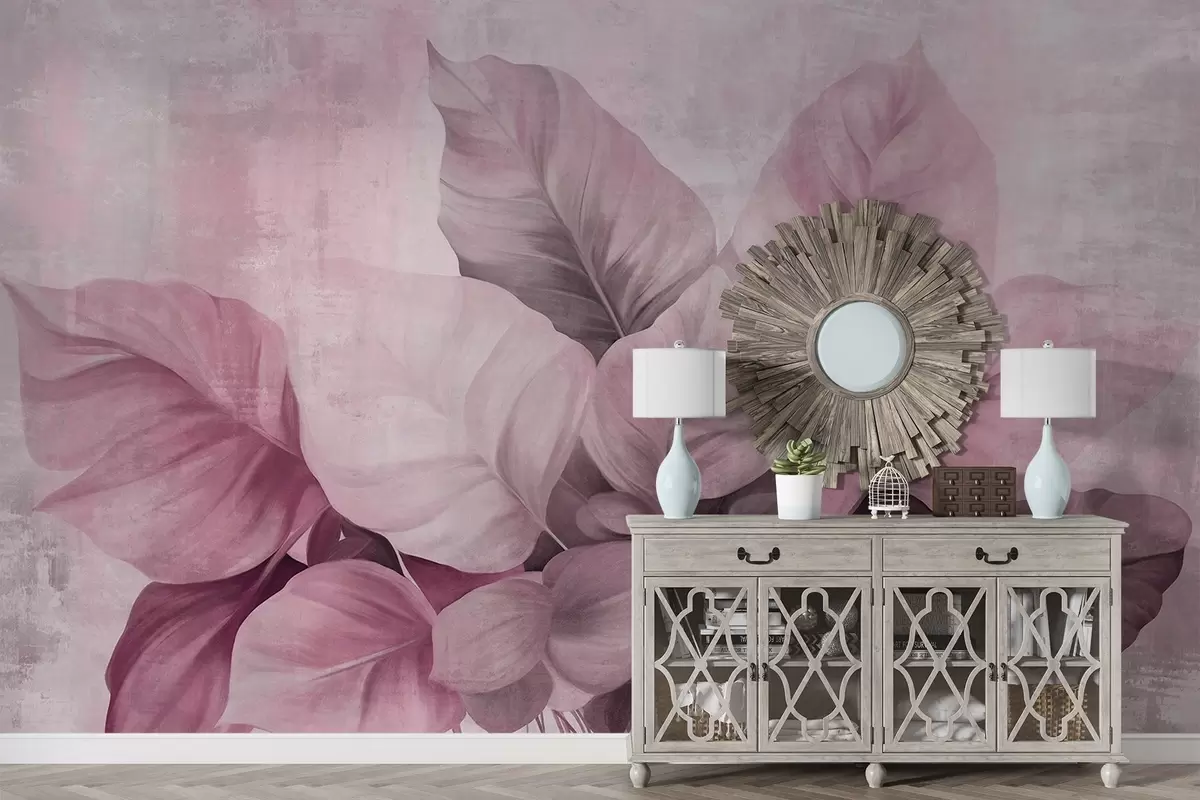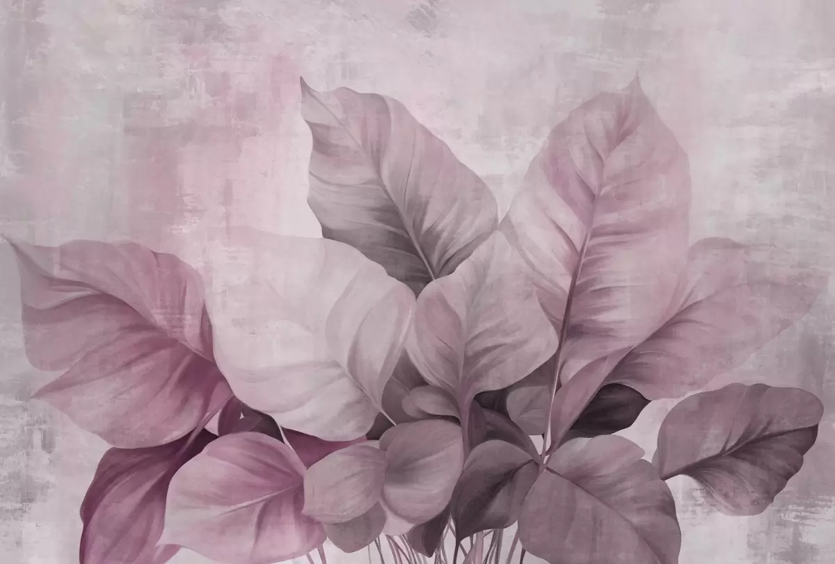 Papel de pared Imitacione de pintura texturizada de hojas grandes de color rosa claro sobre un fondo neutro con pinceladas sutiles. Nr. w09614v1