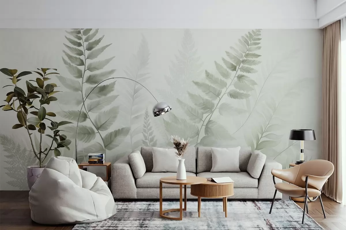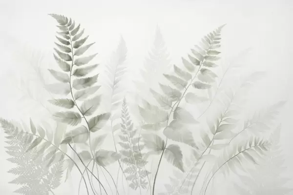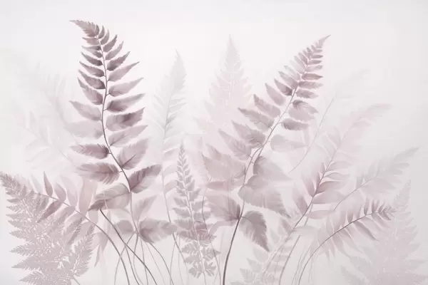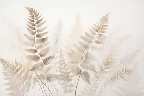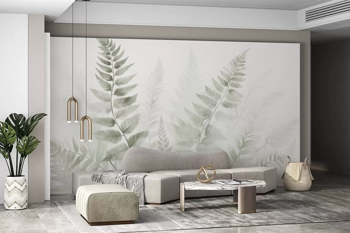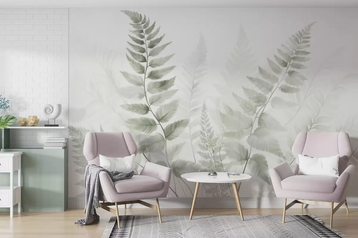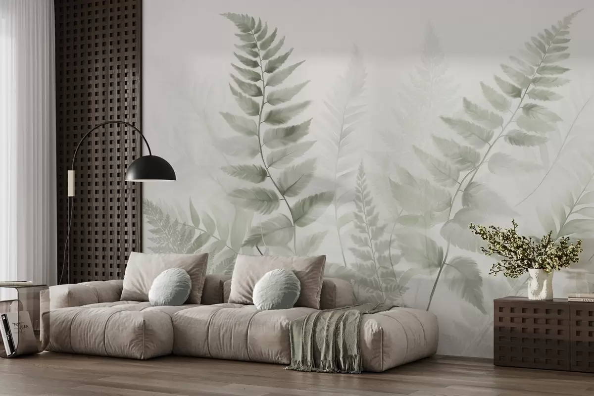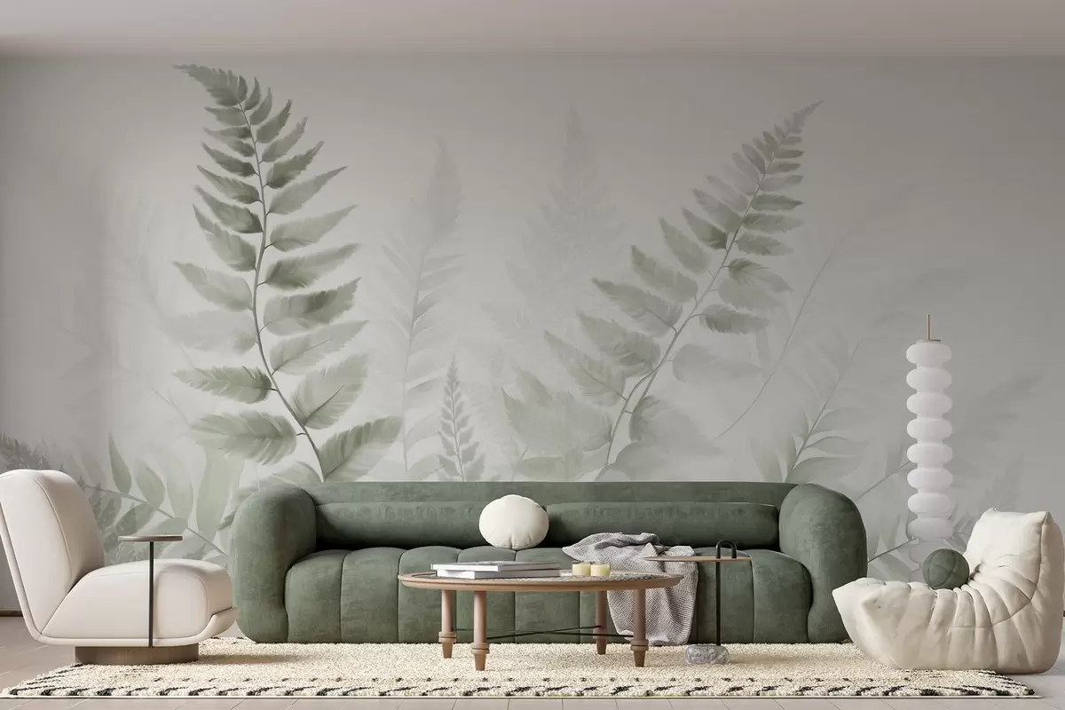 Papel de pared Hojas secas de helecho con textura en varios tonos de verde, con un fondo suave y claro en estilo acuarela. Nr. w09615v1