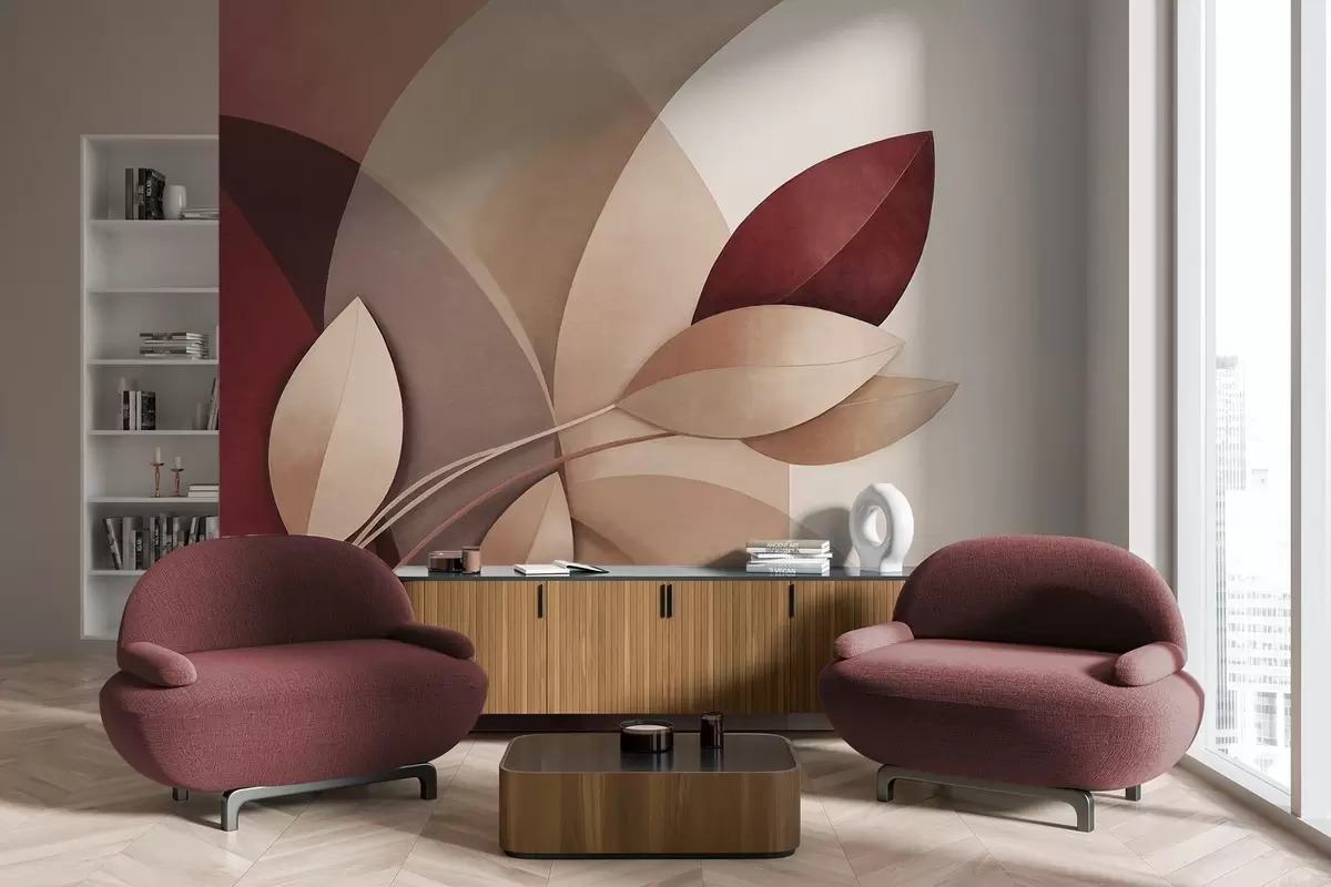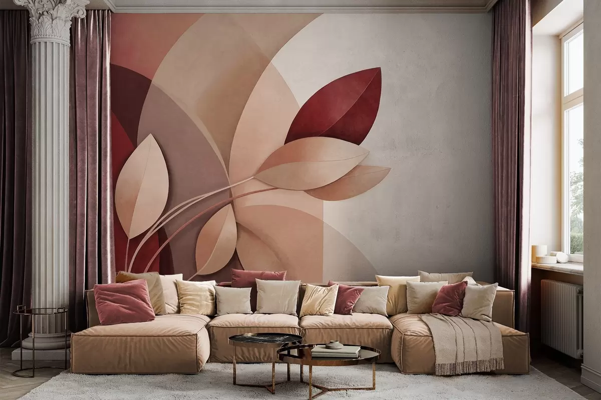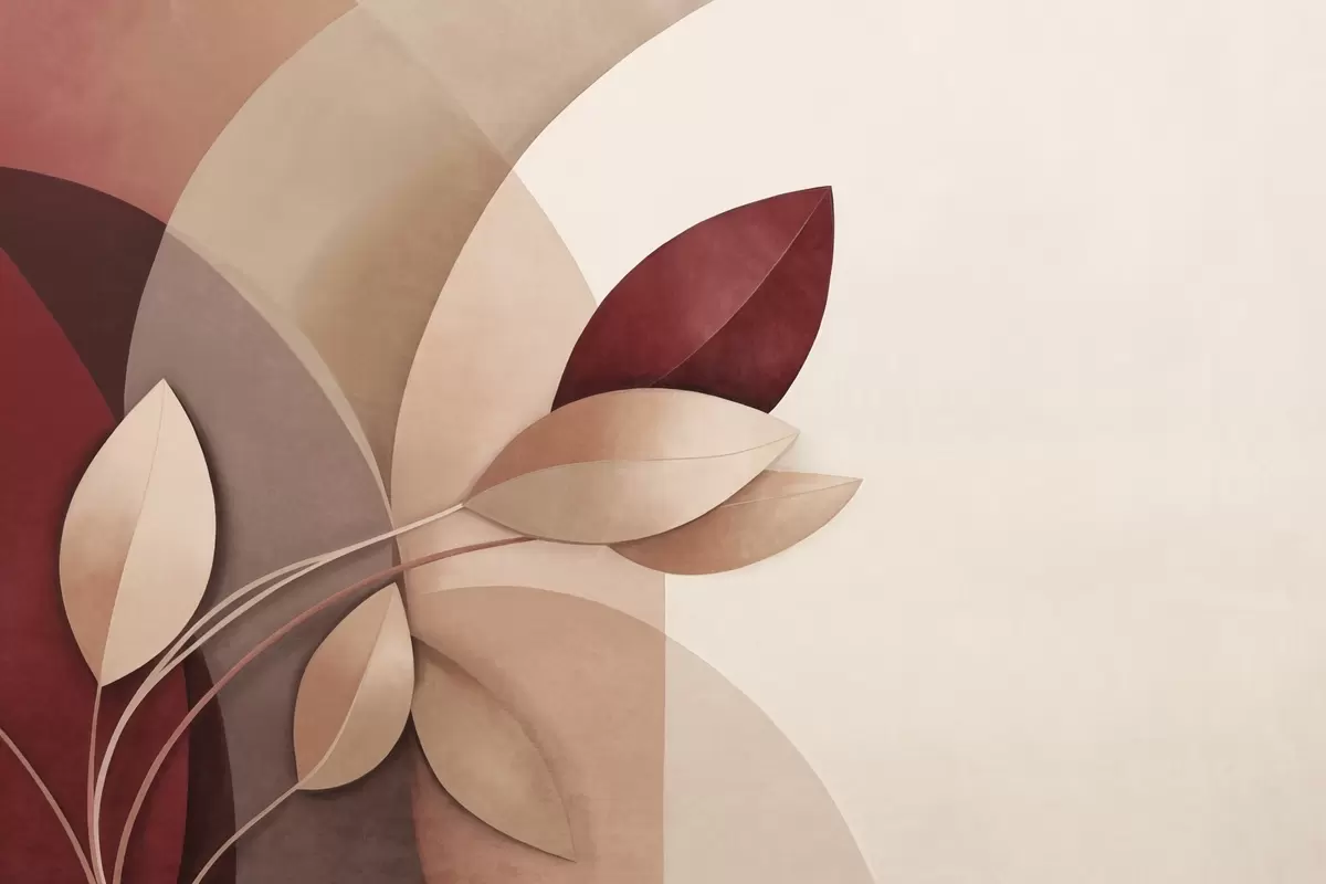 Papel de pared Rama abstracta con textura y hojas en tonos marrones, beige y rojos, sobre un fondo de formas abstractas. Nr. w09618
