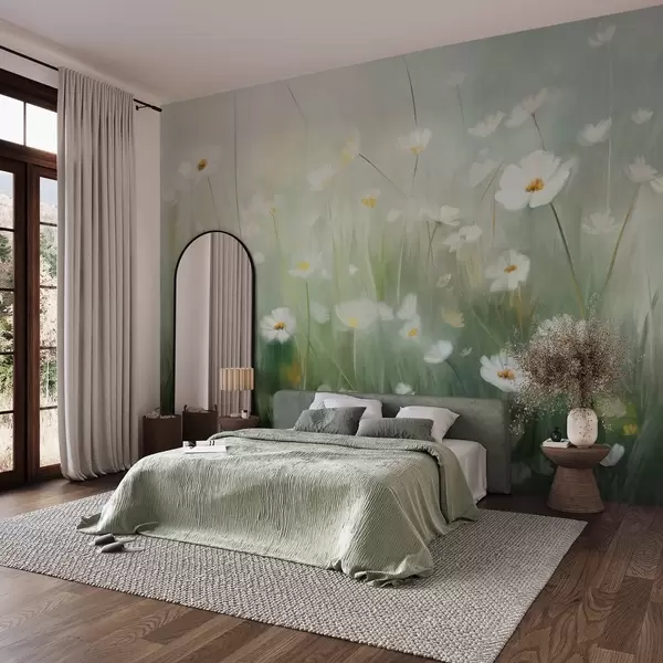 Papel de pared Campo abstracto de margaritas blancas con hierba verde y un fondo suave y difuso en estilo pictórico. Nr. w09619