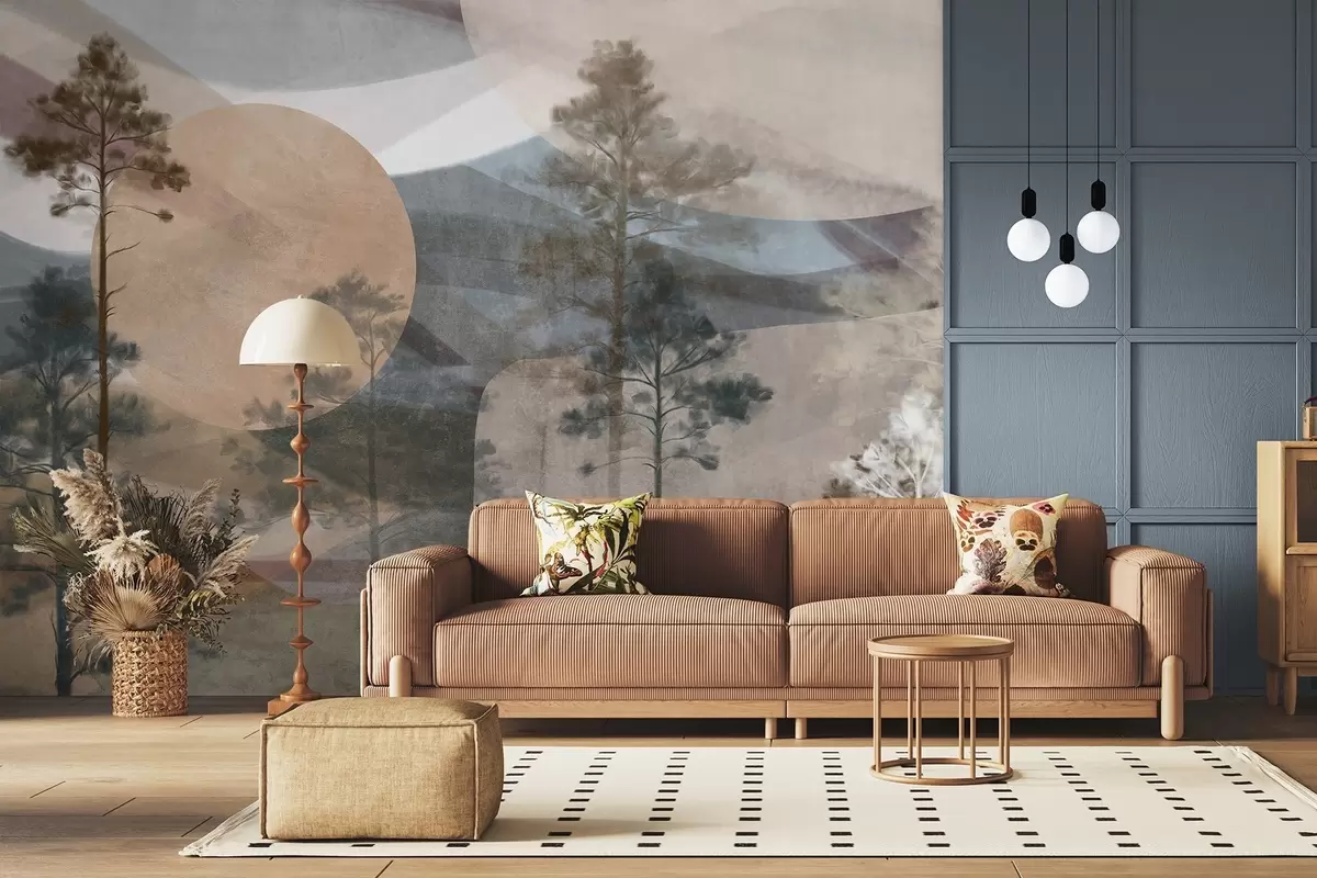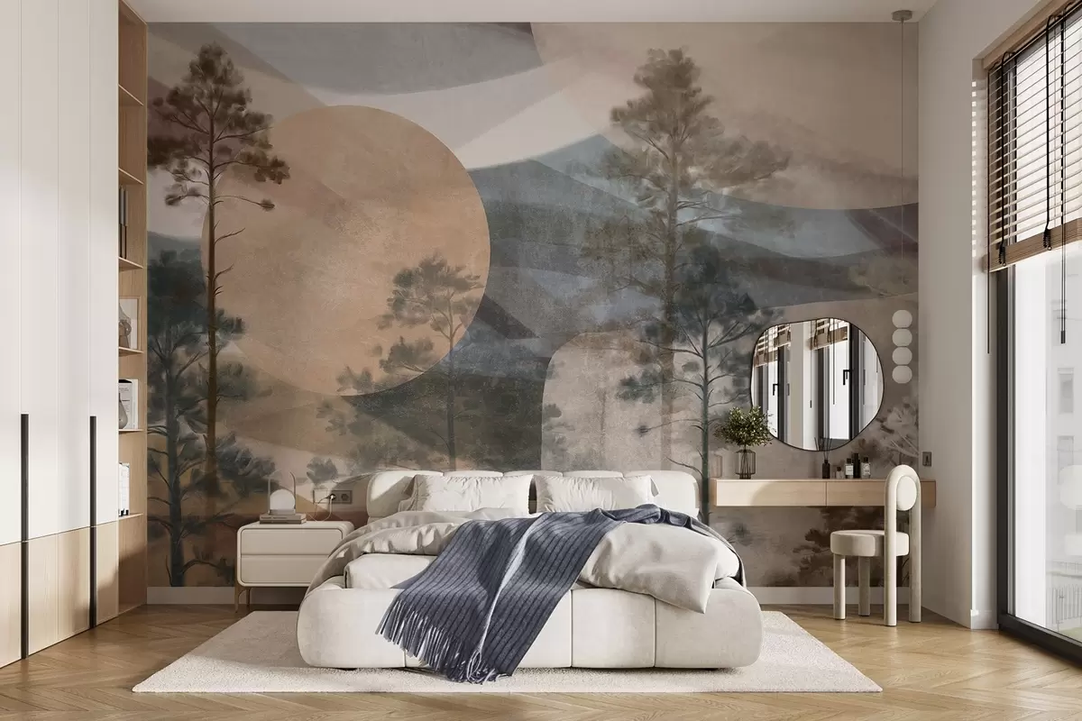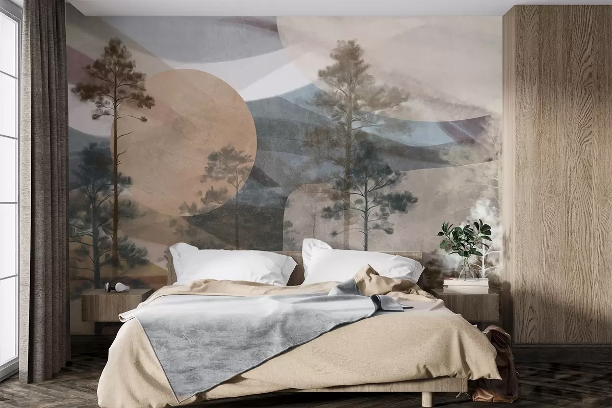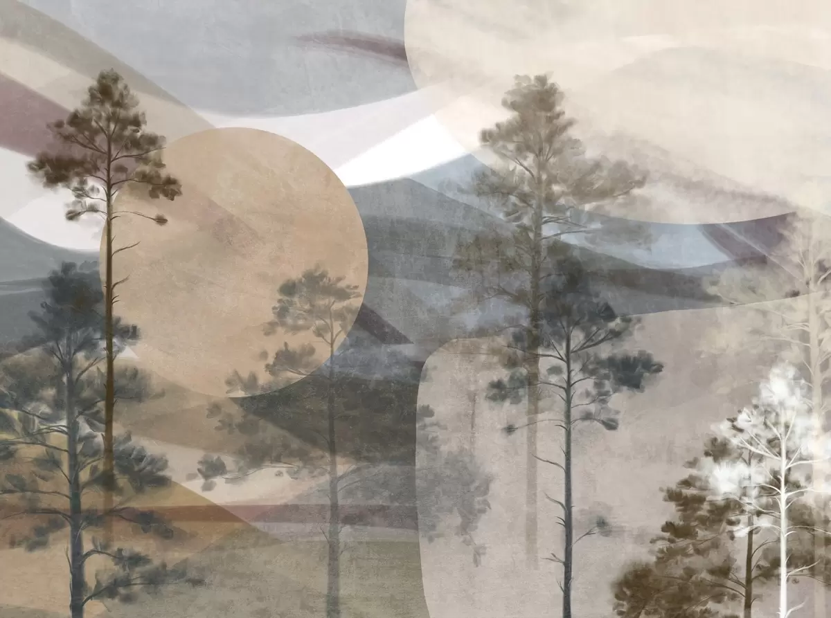 Papel de pared Altos pinos en un paisaje de textura apagada con formas circulares abstractas y montañas en capas en tonos terrosos. Nr. w09636