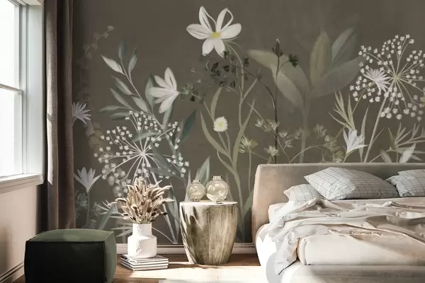 Papel de pared Delicadas flores silvestres y follaje con textura en tonos verdes y crema apagados sobre un fondo marrón. Nr. w09641v1