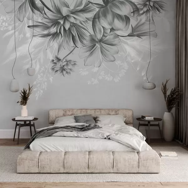 Papel de pared Flores y helechos texturizados en tonos gris oscuro y blanco sobre un fondo gris apagado, estilo de dibujo. Nr. w09644v1