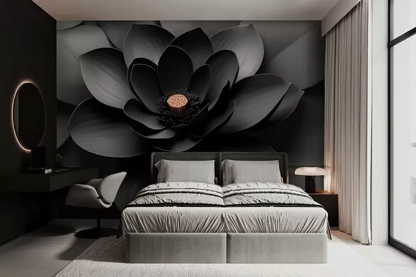 Papel de pared Flor negra minimalista con pétalos y un centro cálido que contrasta Nr. w09721