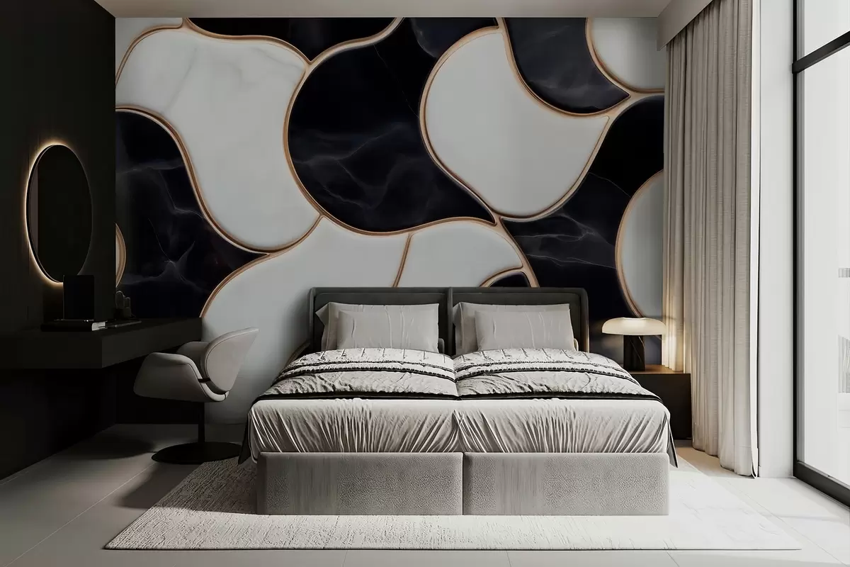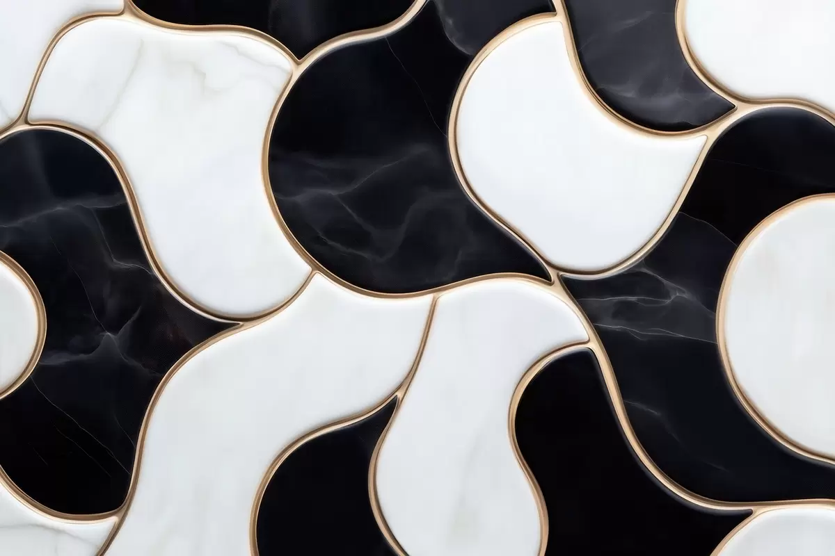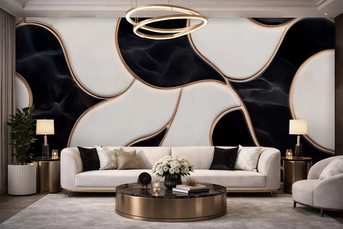 Papel de pared Imitación abstracta de una composición de mármol en tonos blancos y negros con líneas amarillas Nr. w09733
