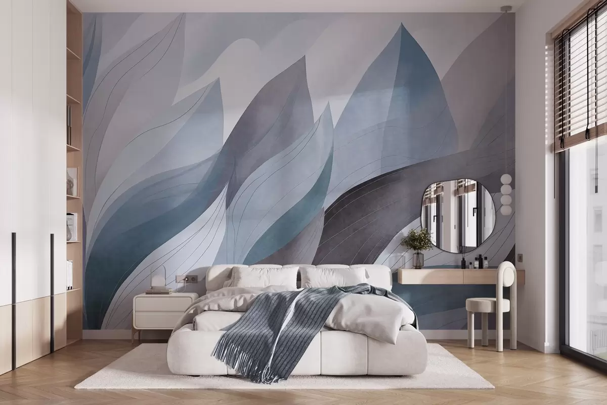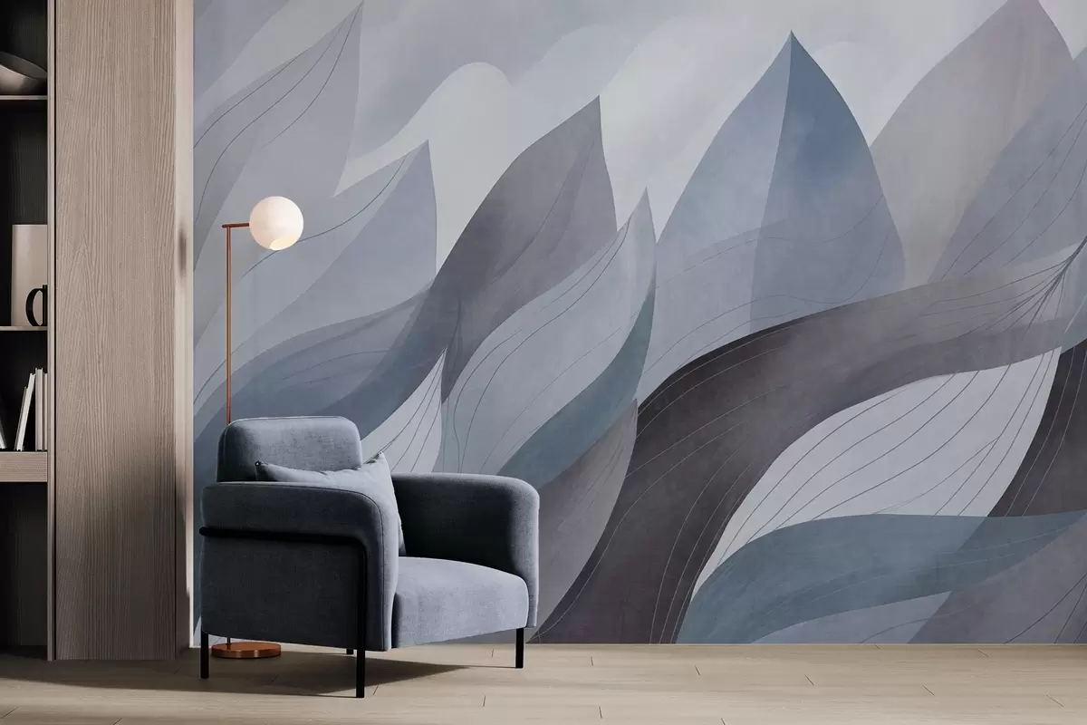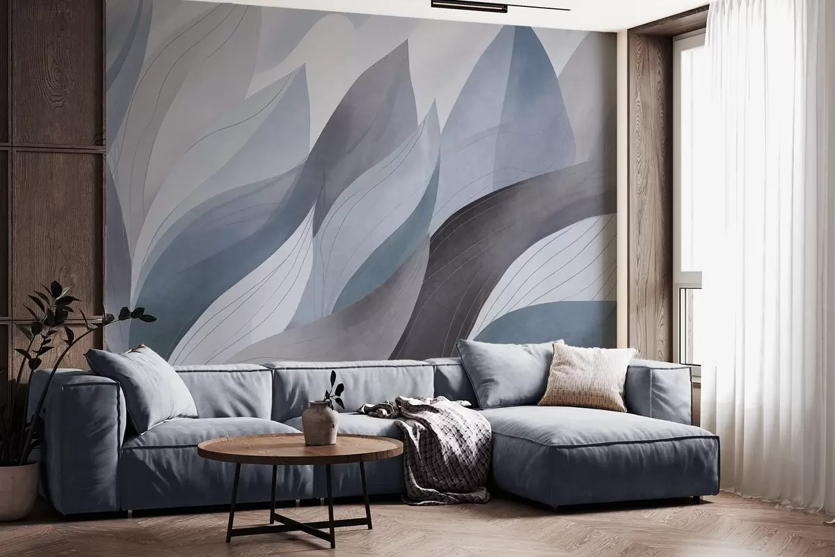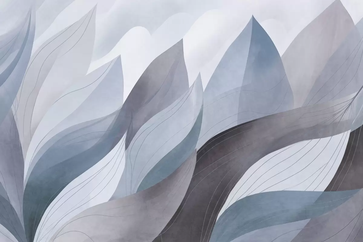 Papel de pared Hojas abstractas, tonos tierra apagados en azul con delicados detalles lineales, textura suave de acuarela. Nr. w09736v1