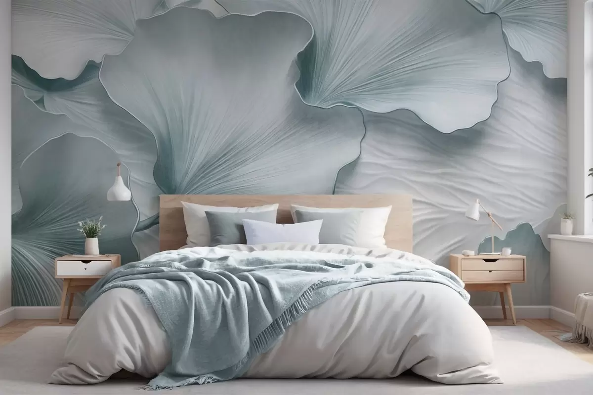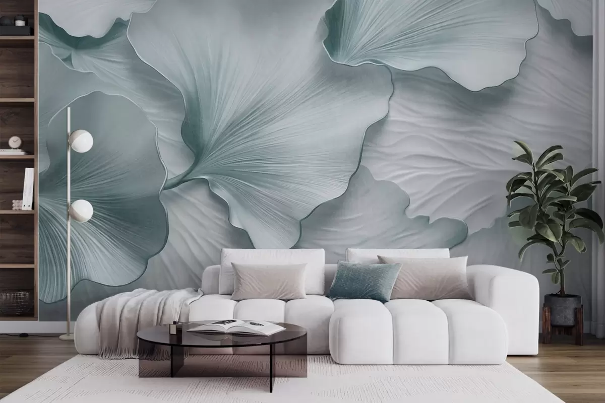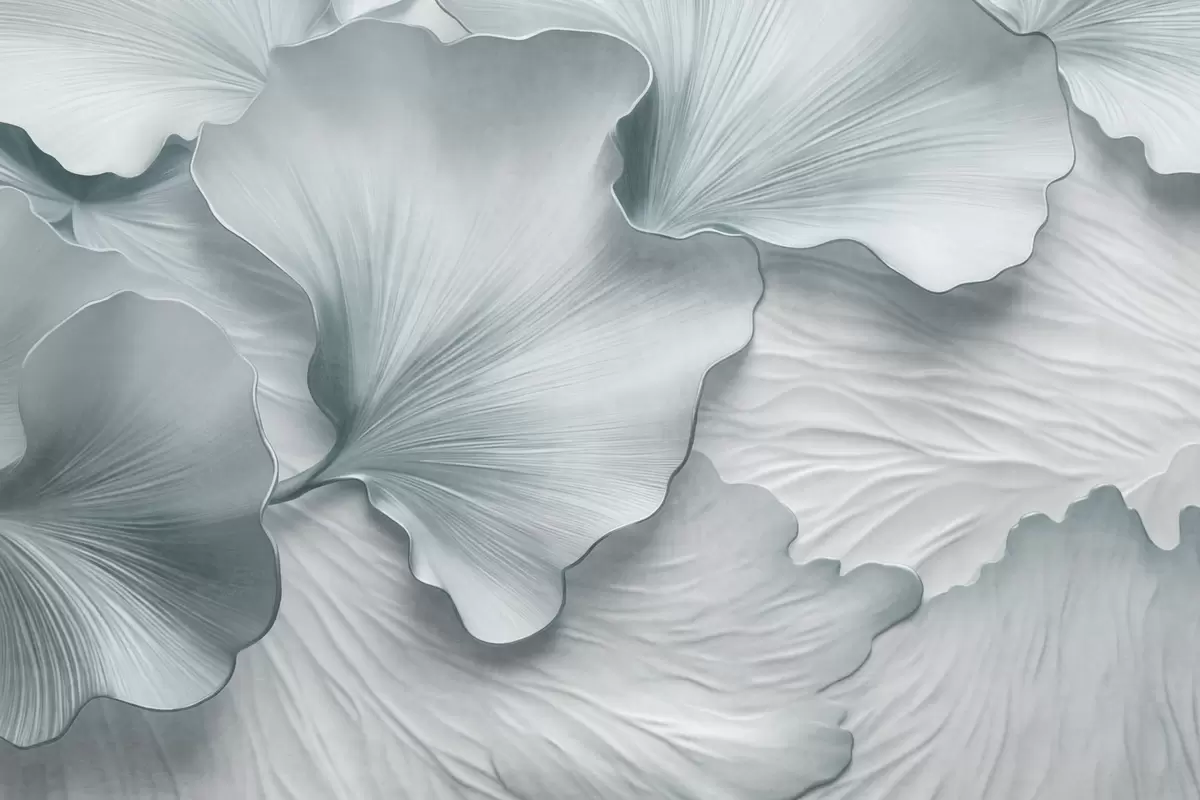 Papel de pared Pétalos de hojas de ginkgo texturizados, azules y blancos, con un delicado estampado orgánico. Nr. w09741v1
