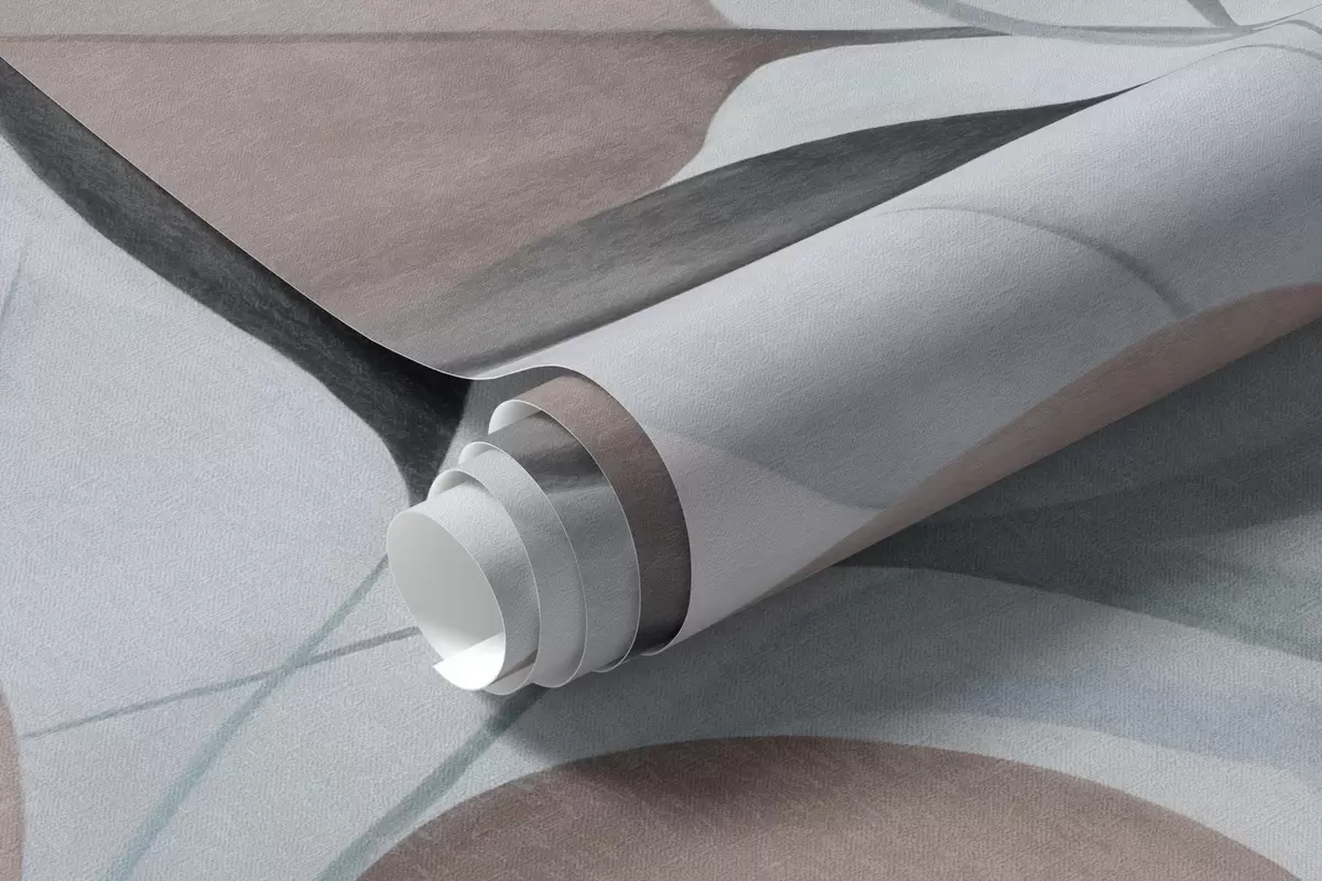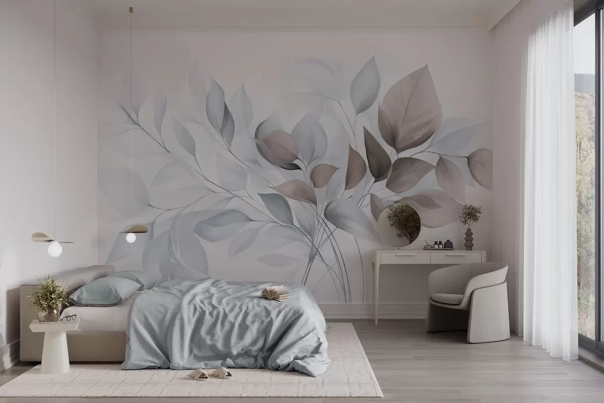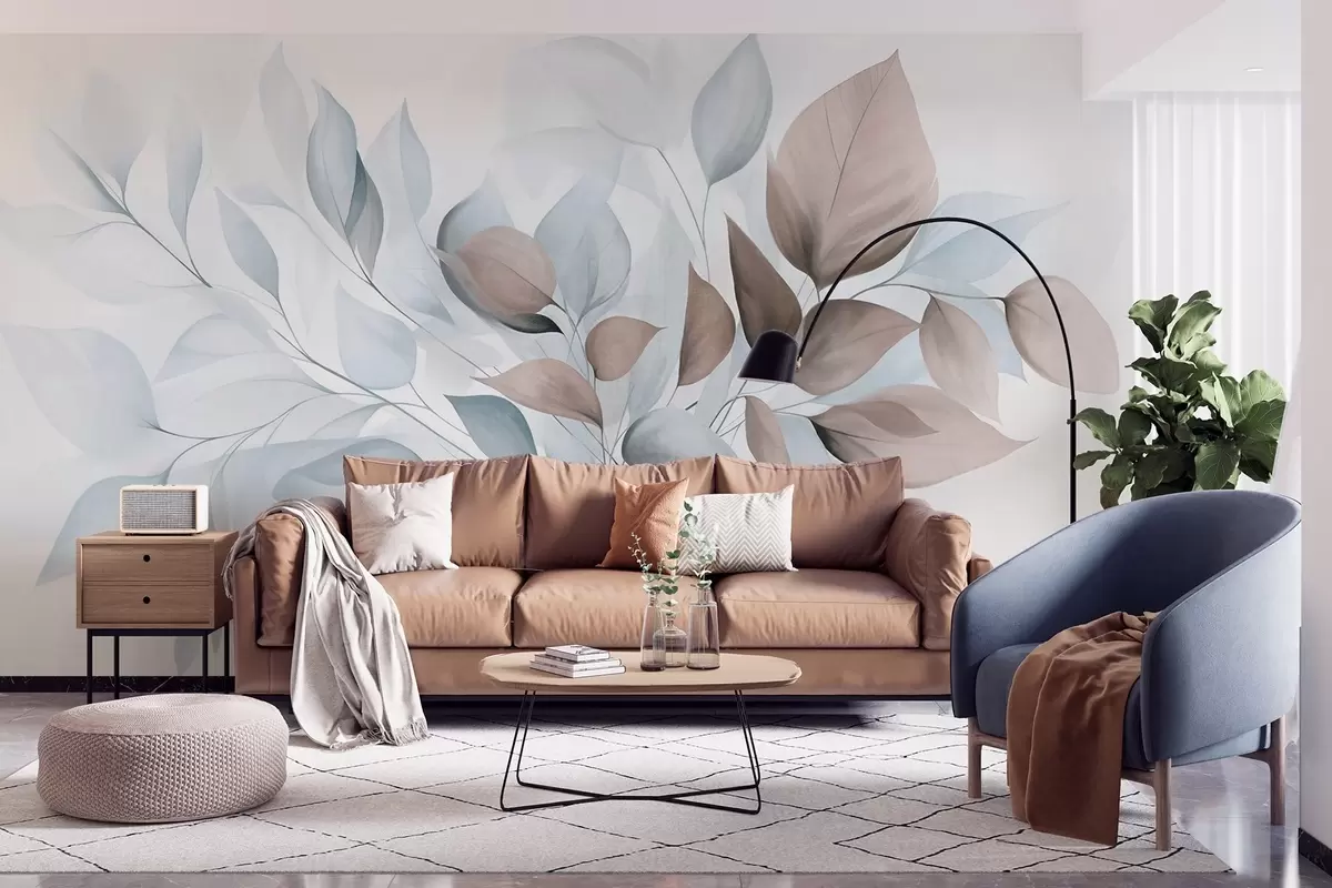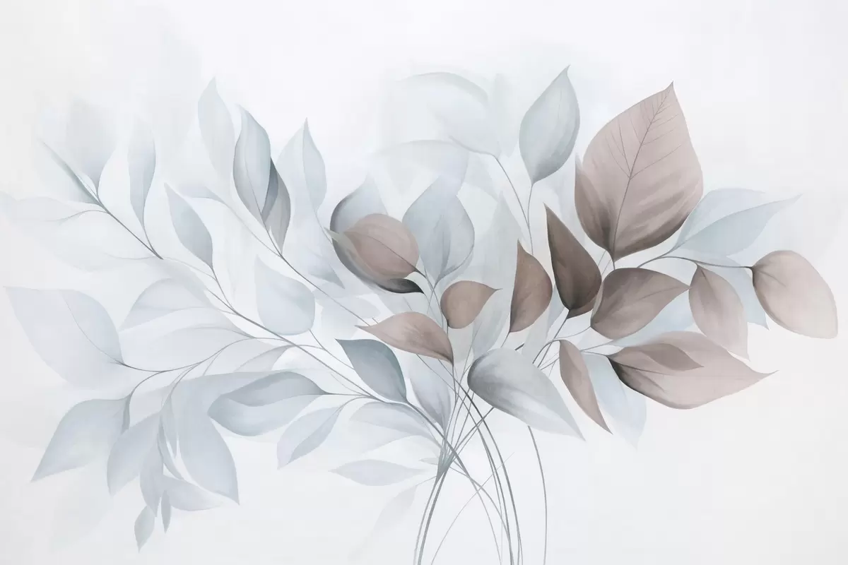 Papel de pared Hojas abstractas translúcidas en tonos azules, beige y marrones, arte texturizado. Nr. w09744v1