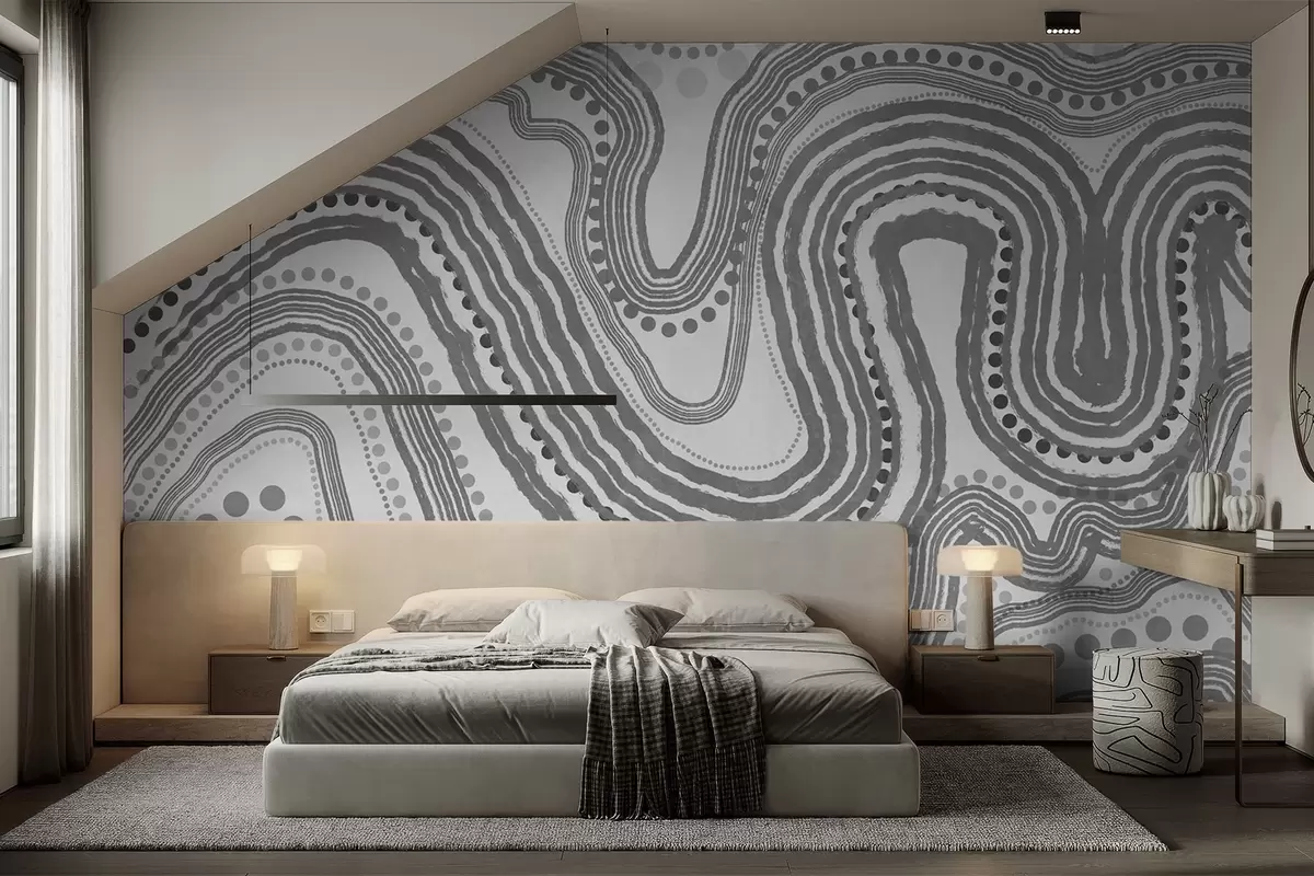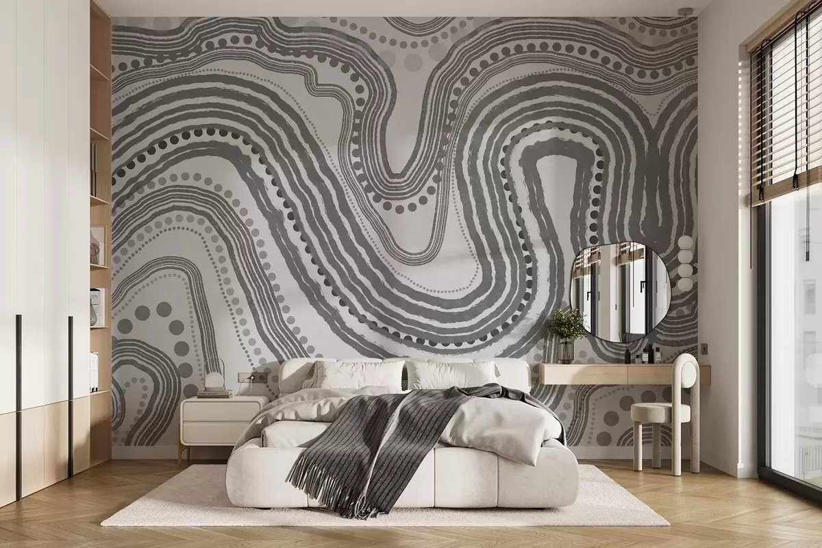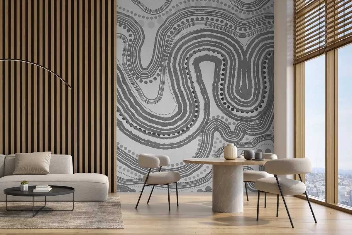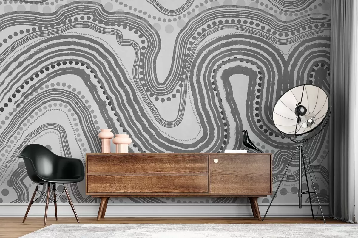 Papel de pared Líneas onduladas y puntos abstractos en gris oscuro, arte moderno con textura. Nr. w09747v2