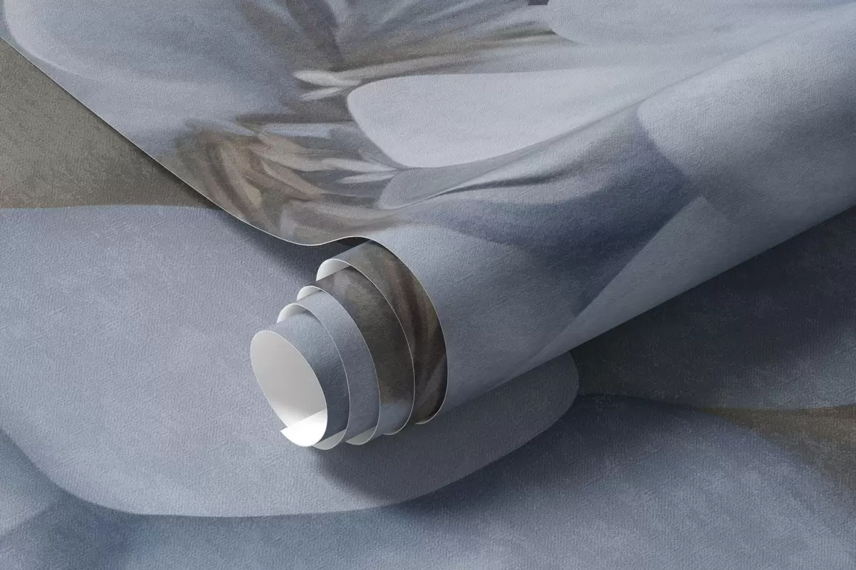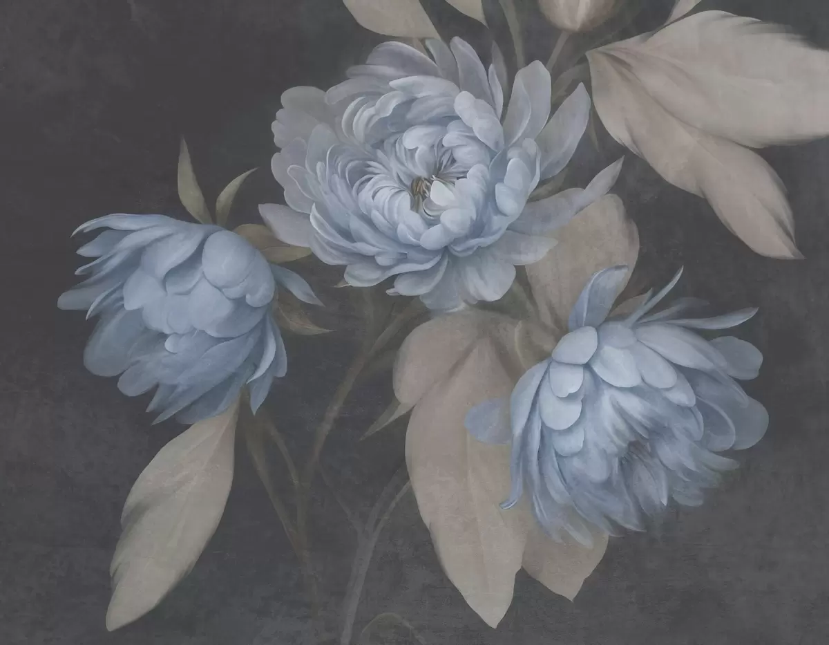 Papel de pared Flores de peonía azul claro con textura y hojas de color beige sobre un fondo oscuro Nr. w09751