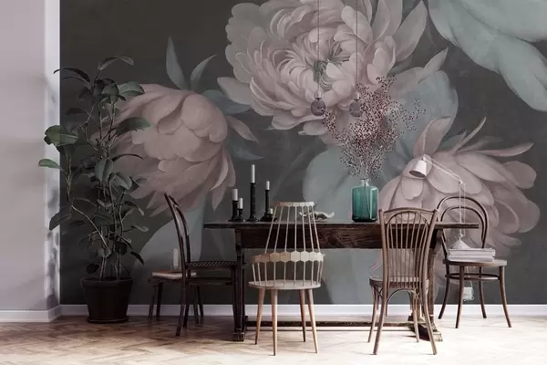 Papel de pared Flores de peonía de color rosa claro con textura y hojas de un verde apagado sobre un fondo oscuro Nr. w09751v1