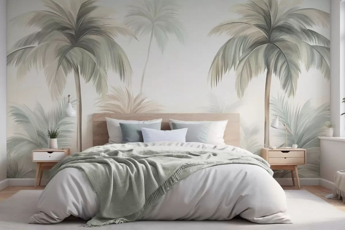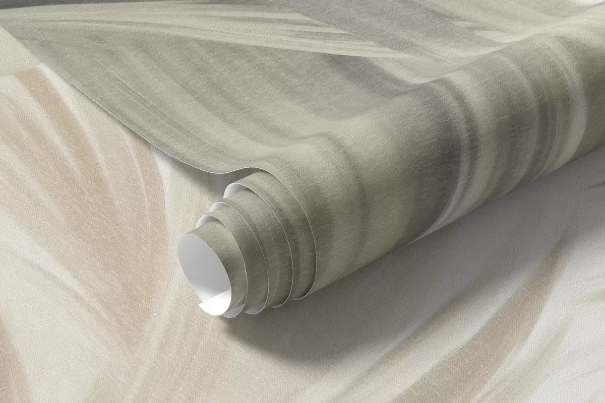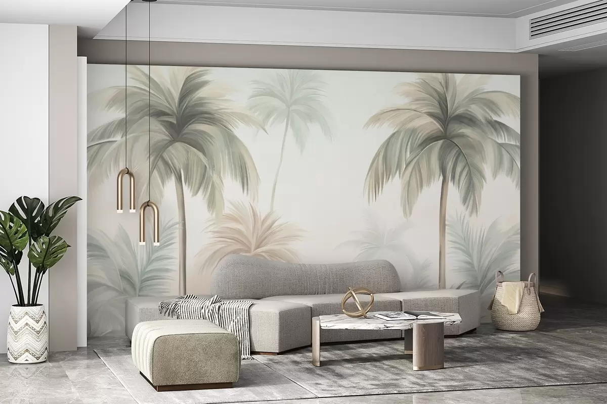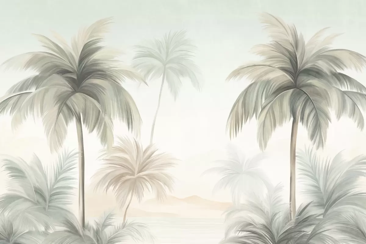 Papel de pared Palmeras con hojas de textura rugosa en tonos verdes apagados y beige, recortadas contra un cielo suave Nr. w09770