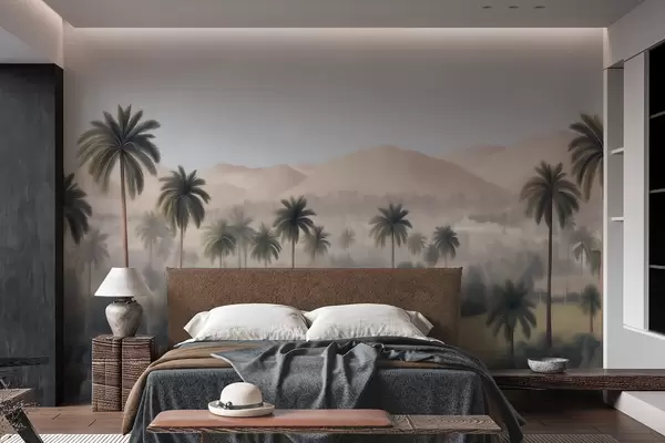 Papel de pared Paisaje tropical con palmeras y montañas, panorámica de estilo vintage en tonos beige y verdes Nr. w09798