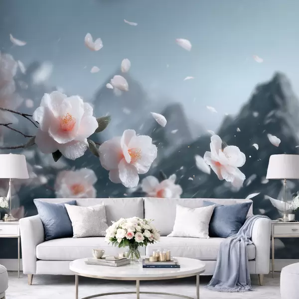 Papel de pared Delicadas flores de cerezo con las montañas de fondo; evocador paisaje japonés en tonos pastel Nr. w09808