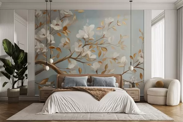 Papel de pared Rama de árbol con textura, flores blancas y hojas amarillas, estilo vintage Nr. w09814