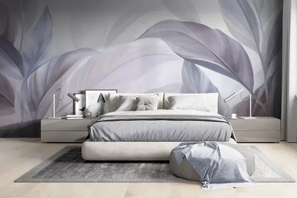 murales Hojas tropicales grandes, de color azul pálido y violeta, con tonos suaves y pasteles, y una textura artística w09816v1