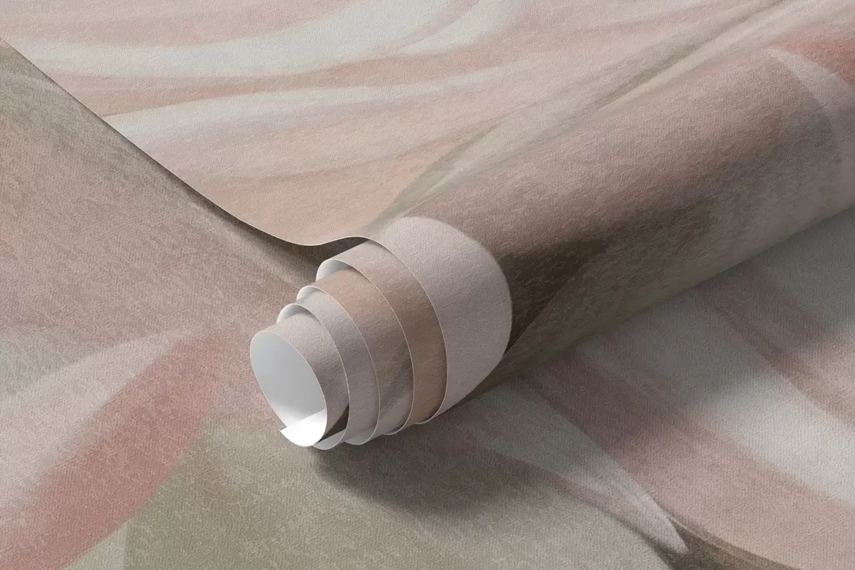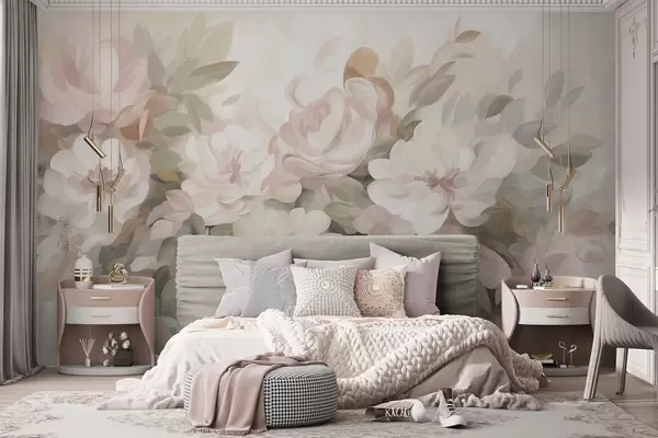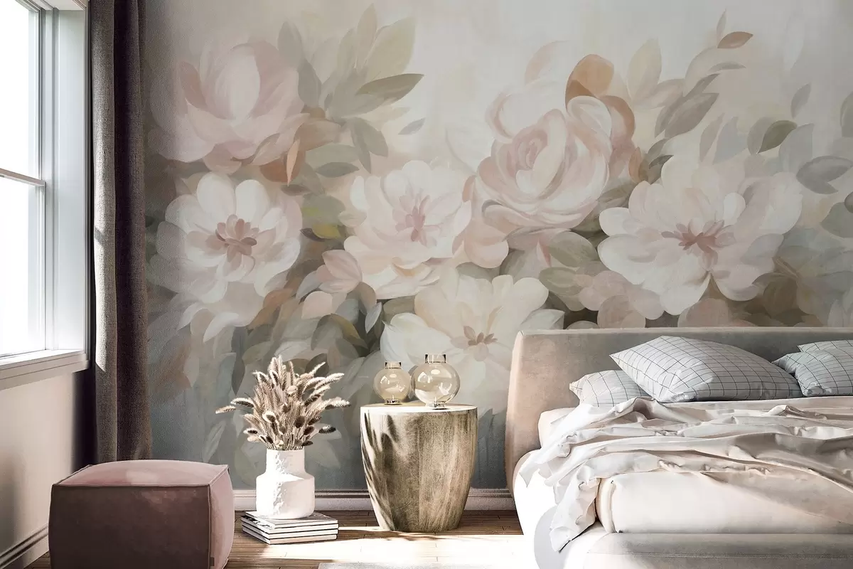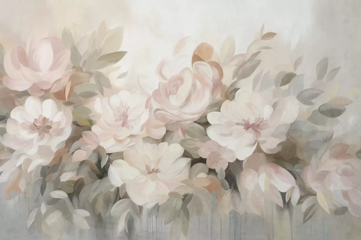 Papel de pared Flores de color rosa pálido y blanco con hojas verdes, estilo pictórico, estilo impresionista, arte texturizado Nr. w09824