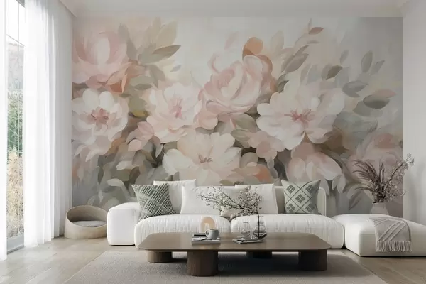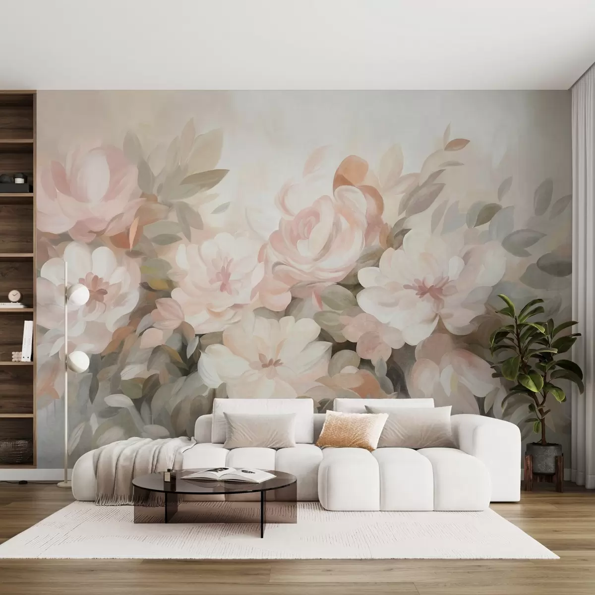 Papel de pared Flores de color rosa pálido y blanco con hojas verdes, estilo pictórico, estilo impresionista, arte texturizado Nr. w09824