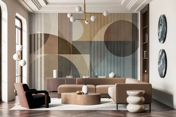 Papel de pared Formas geométricas abstractas con círculos y líneas, tonos tierra apagados, composición con texturas y capas Nr. w09834