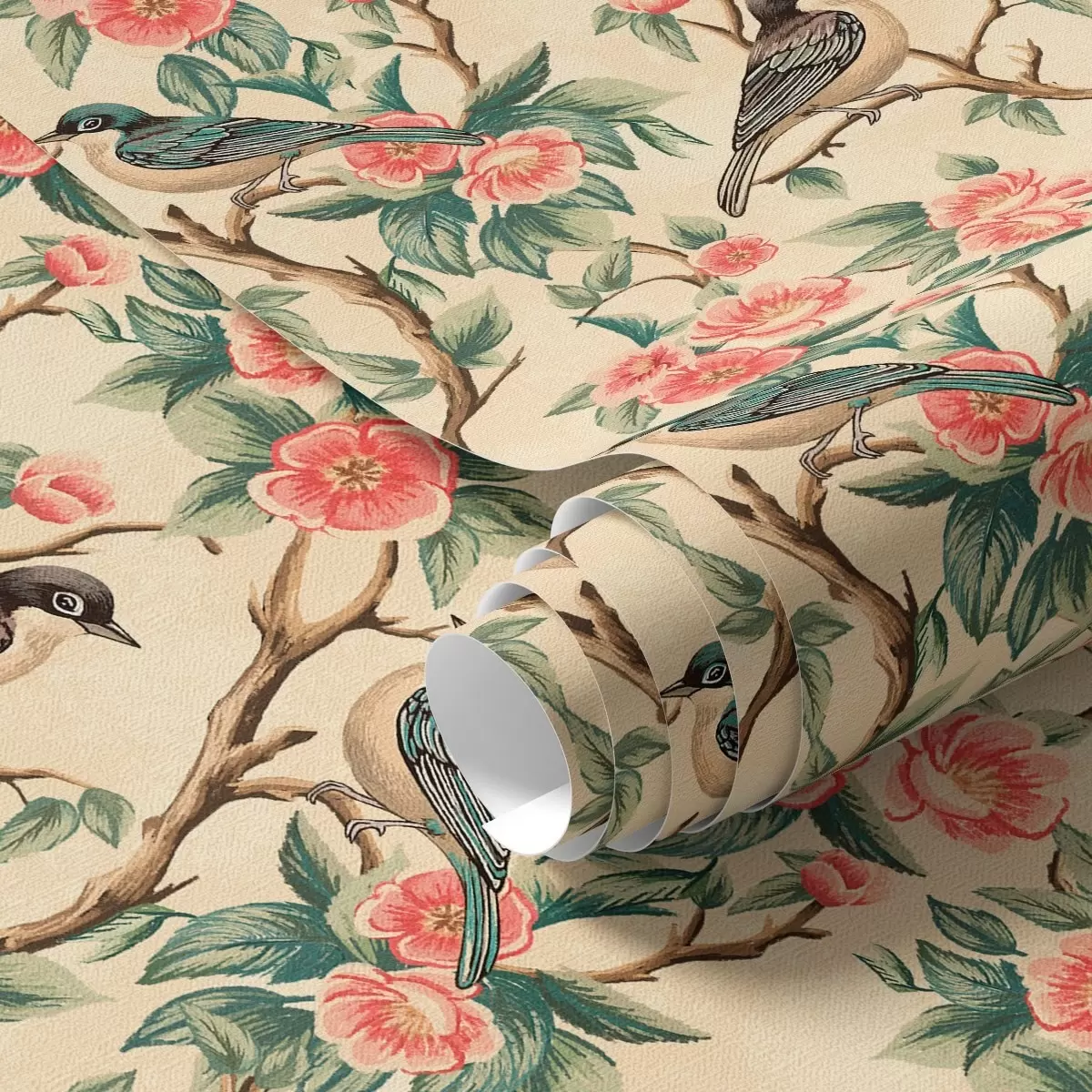 Papel pintado Pequeños pájaros sobre ramas con flores sobre fondo claro a00093
