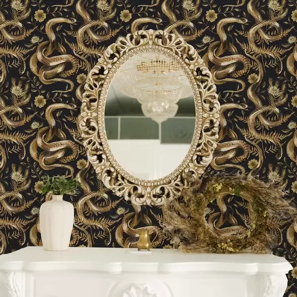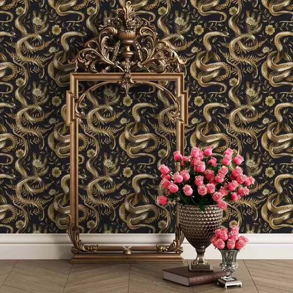Papel pintado Serpientes y flores sobre fondo oscuro a00158
