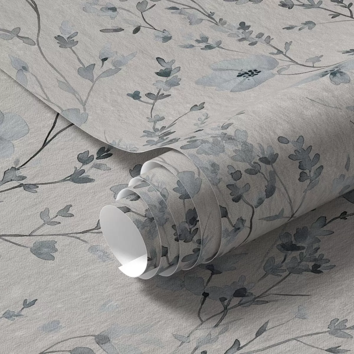 Papel pintado Florística en acuarela azul y gris sobre fondo neutro a00198