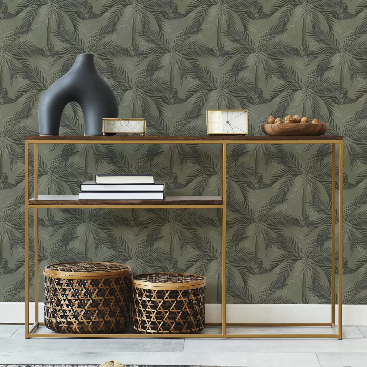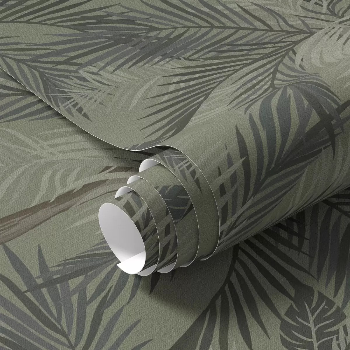 Papel pintado Hojas de palmera sobre fondo de olivo, selva, trópicos a00217