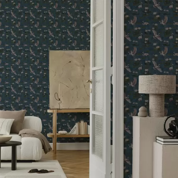 Papel pintado Flamenco entre nenúfares, escena tropical sobre fondo azul marino a00237
