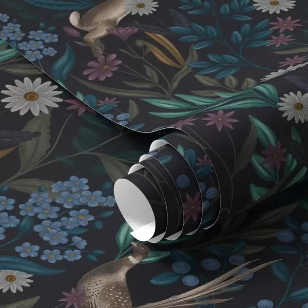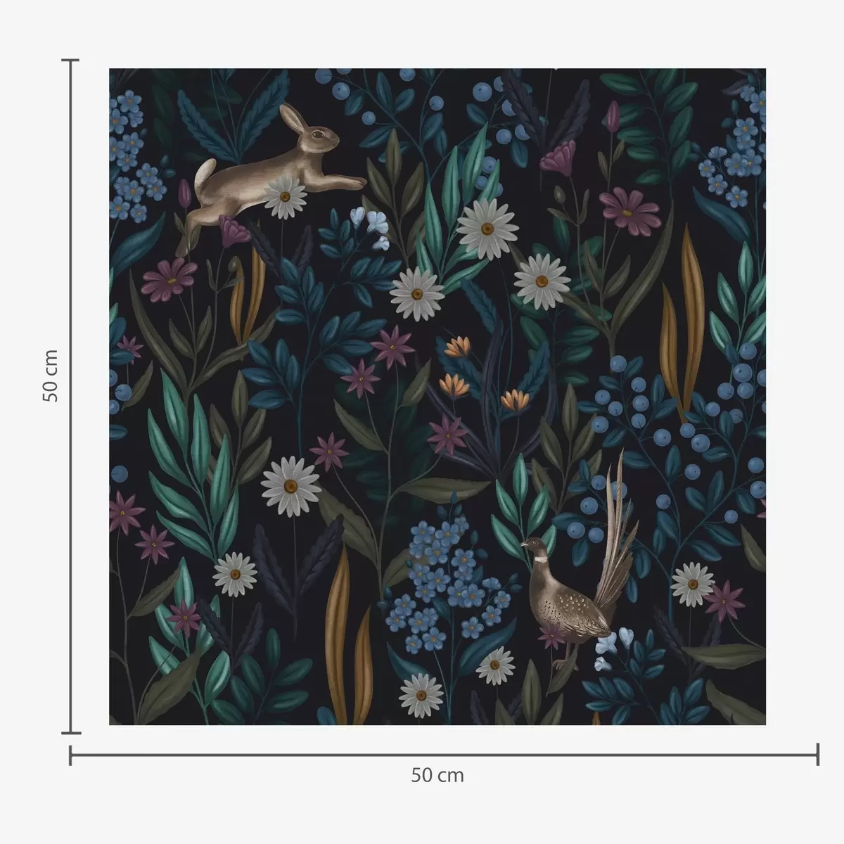 Papel pintado Bosque oscuro con flores, liebre y un pájaro a00310