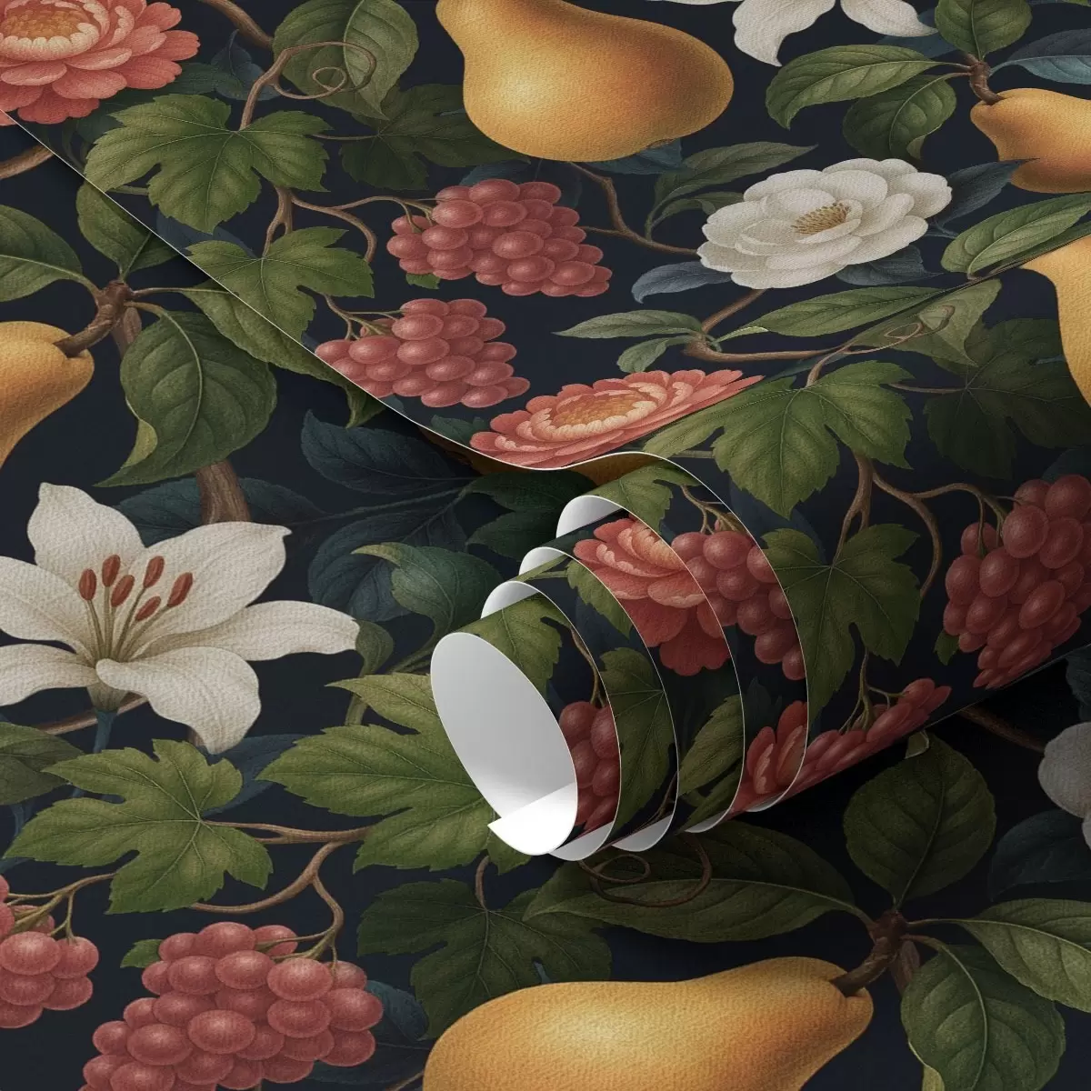 Papel pintado Frutas y flores barrocas sobre un dramático fondo oscuro a00387