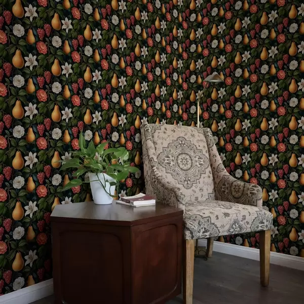 Papel pintado Frutas y flores barrocas sobre un dramático fondo oscuro a00387