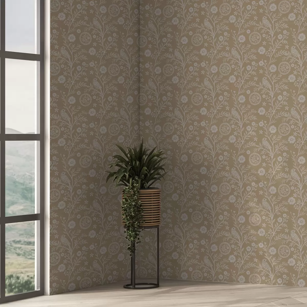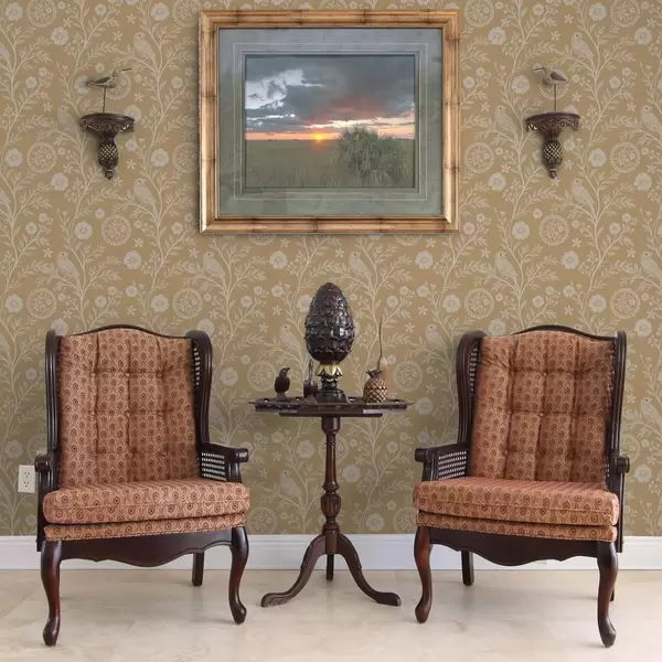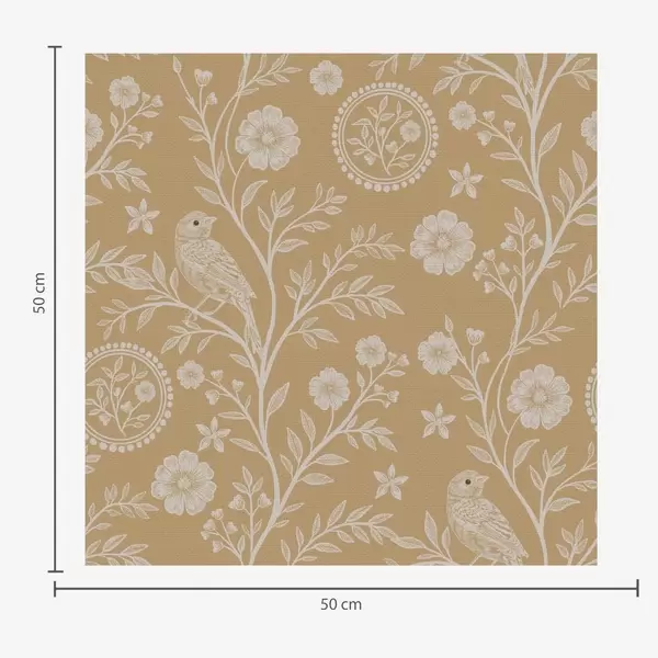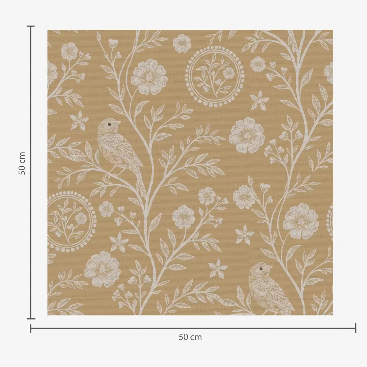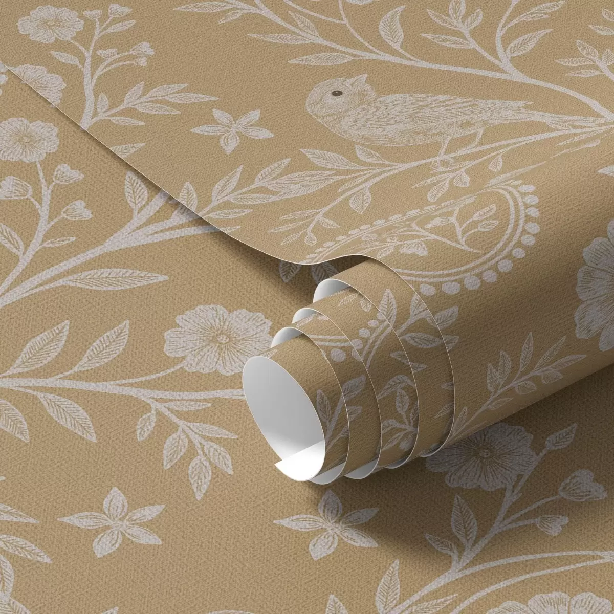 Papel pintado Delicado esbozo de un pájaro y una flor blancos pájaro y flor blancos sobre fondo ocre a00393