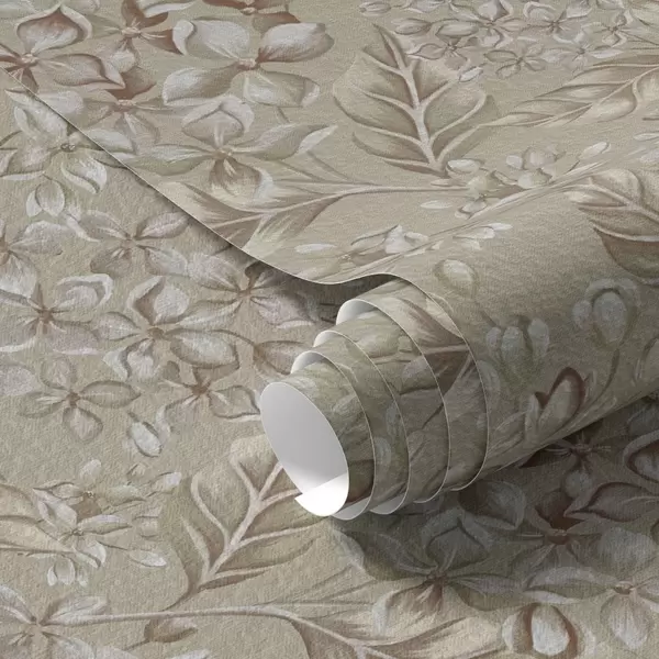 Papel pintado Ramas beige con flores blancas en tonos cálidos a00441