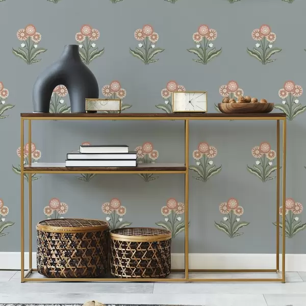 Papel pintado Flores estilizadas sobre fondo gris azulado, paleta cálida a00494