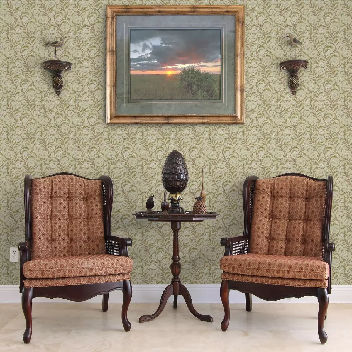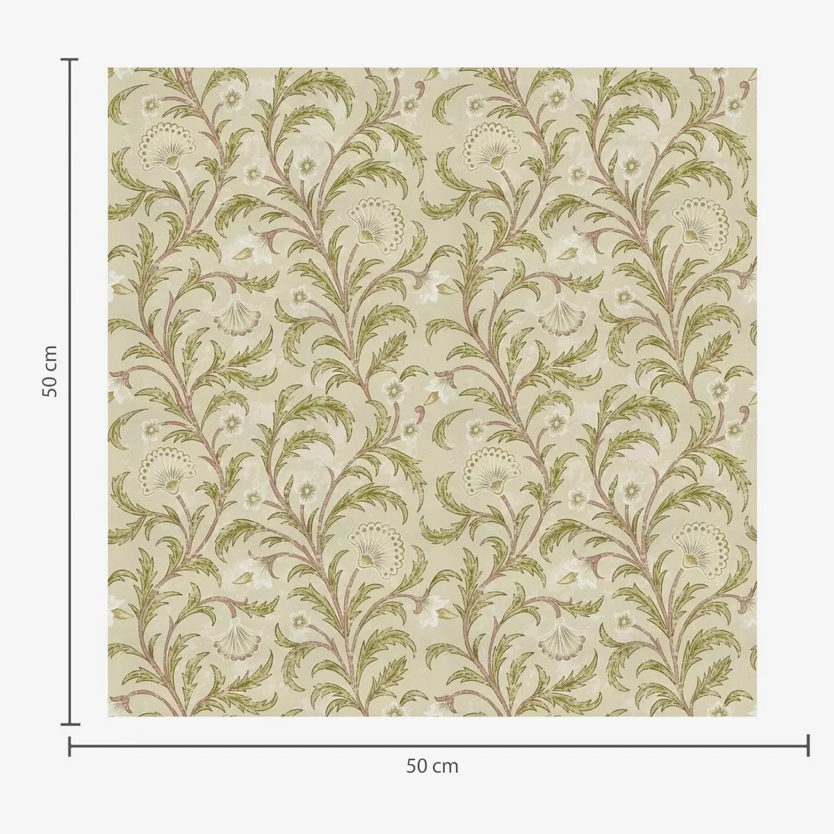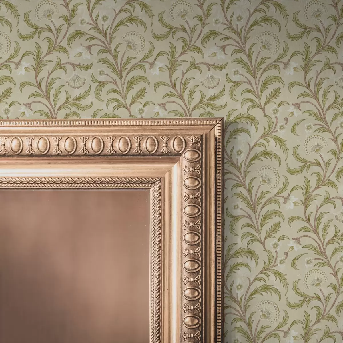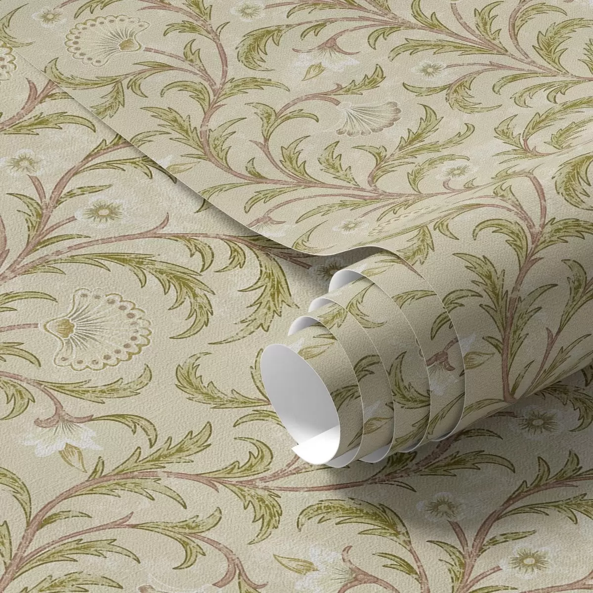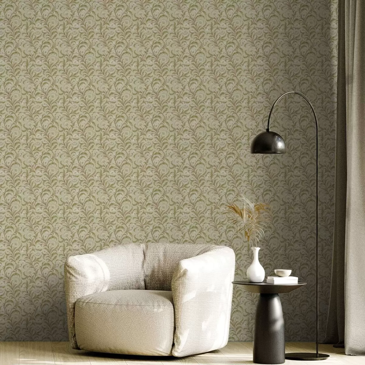 Papel pintado Adorno vintage con volutas y flores, beige y oliva a00574