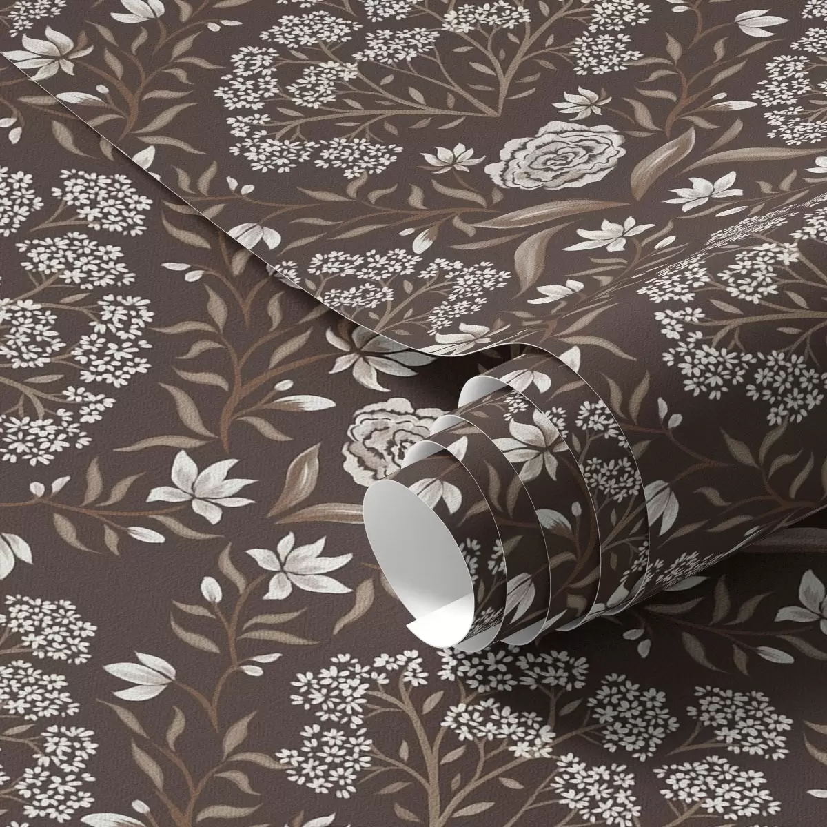 Papel pintado Damasco de chocolate negro con peonías y campanillas de invierno a00603v2
