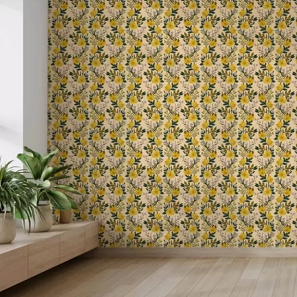 Papel pintado Flores amarillas en guirnaldas verticales sobre fondo crema a00632