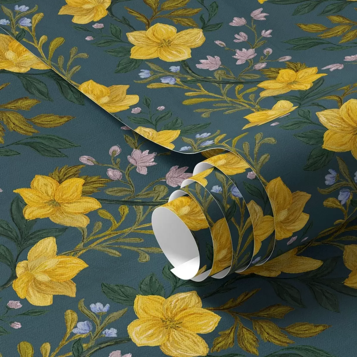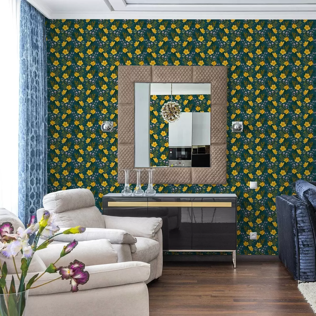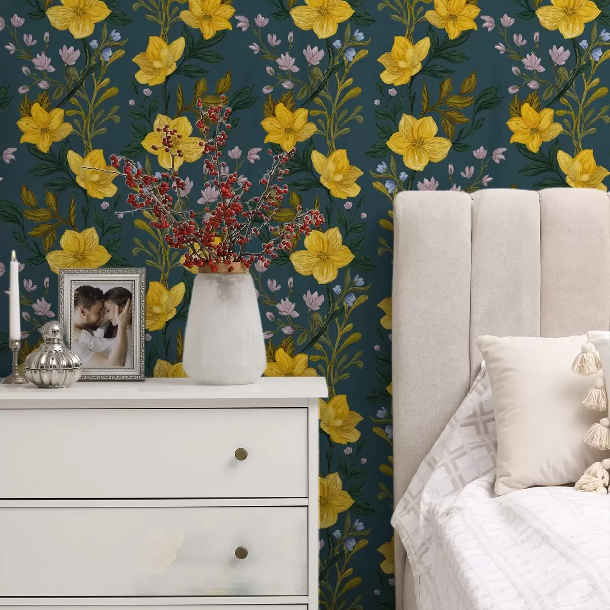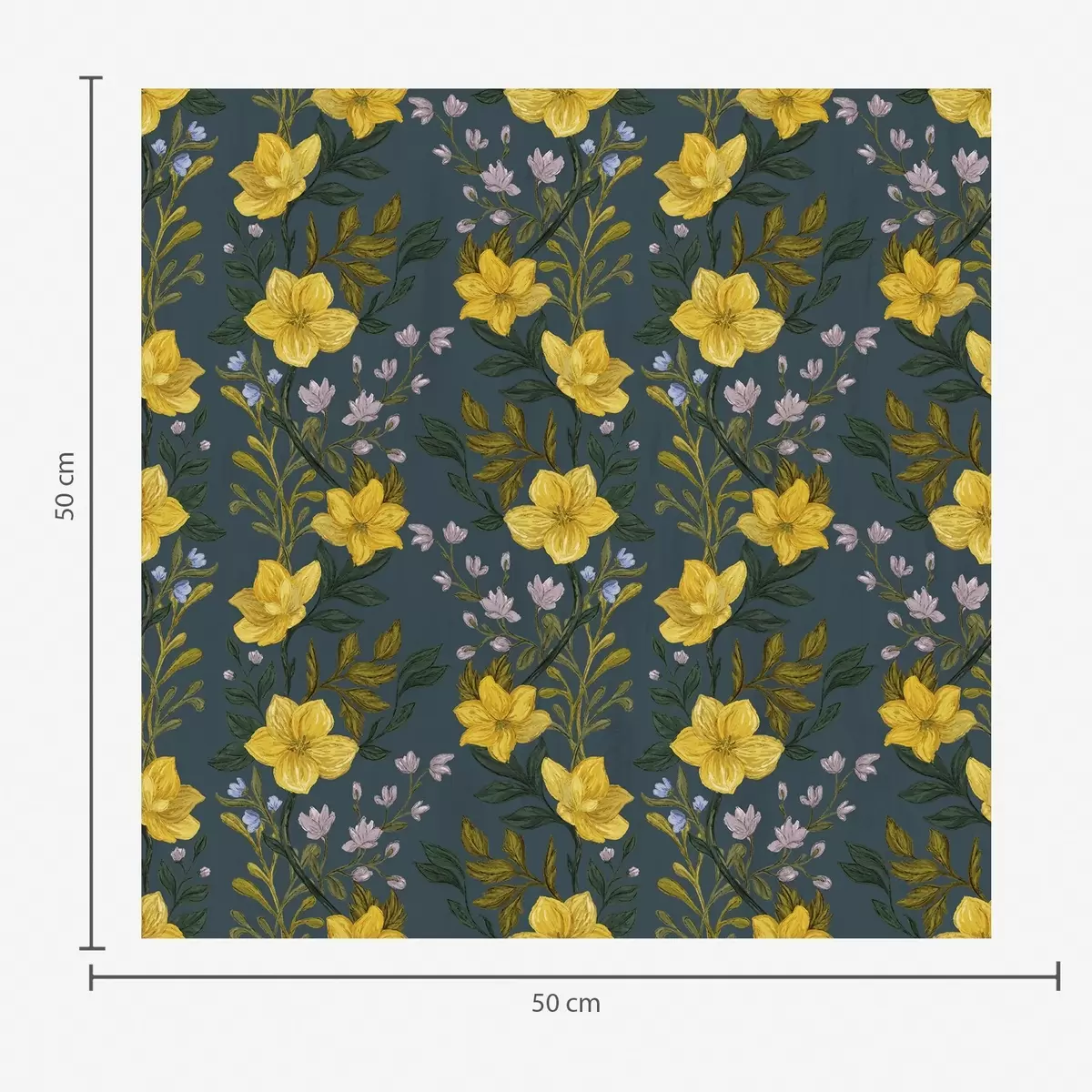 Papel pintado Flores amarillas en guirnaldas verticales sobre fondo azul oscuro a00632v2