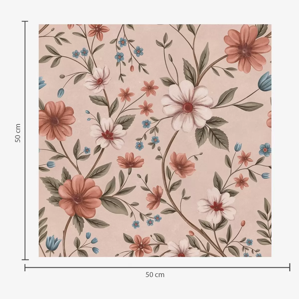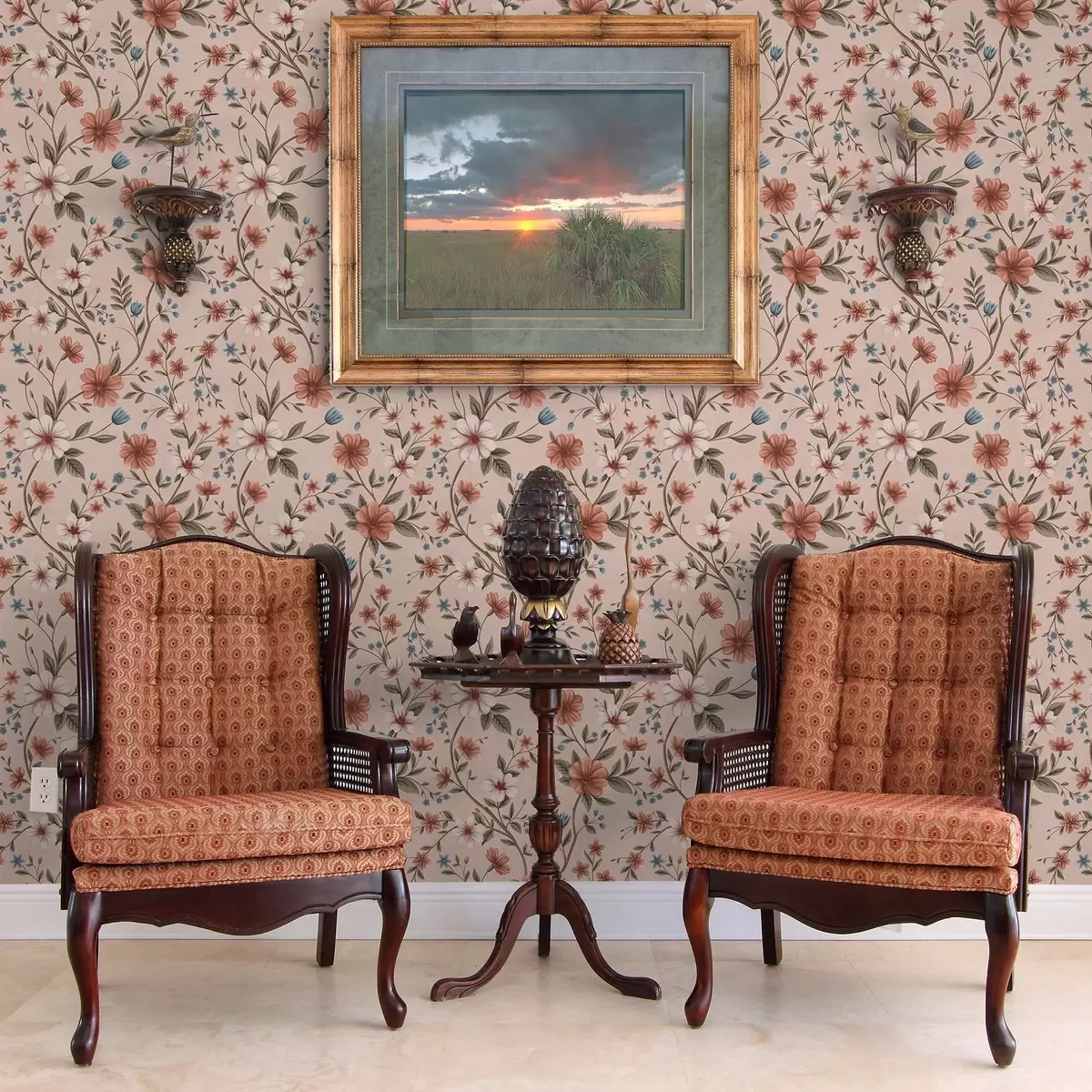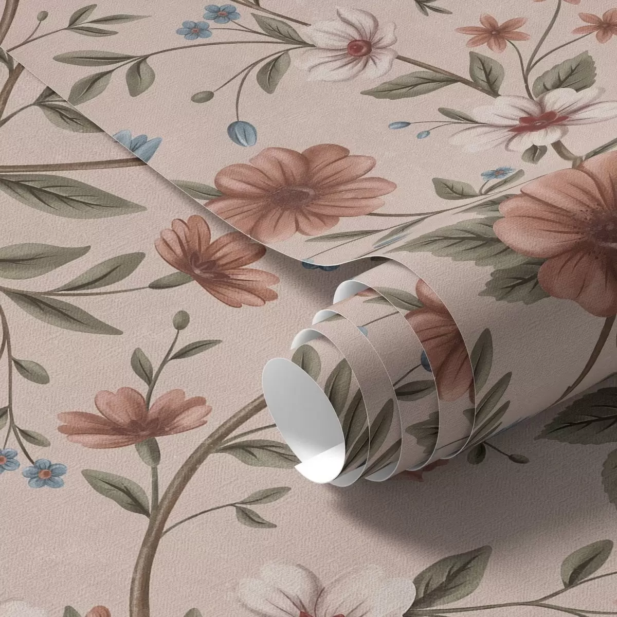 Papel pintado Flores y follaje de color rosa coral sobre fondo rosa empolvado a00667