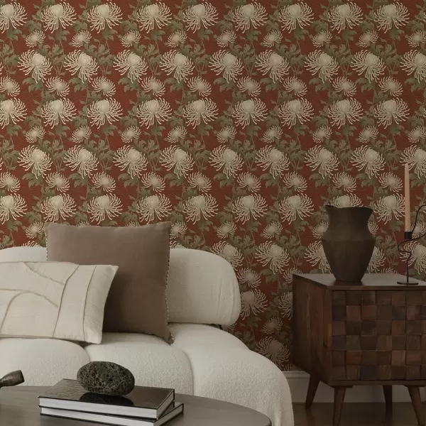 Papel pintado Crisantemos color crema sobre fondo terracota, estilo asiático a00693