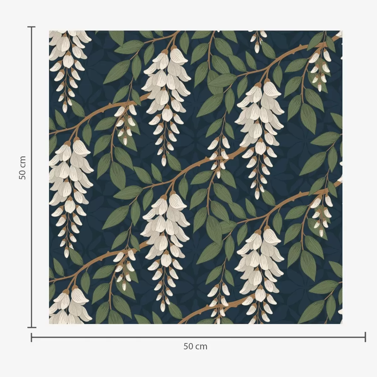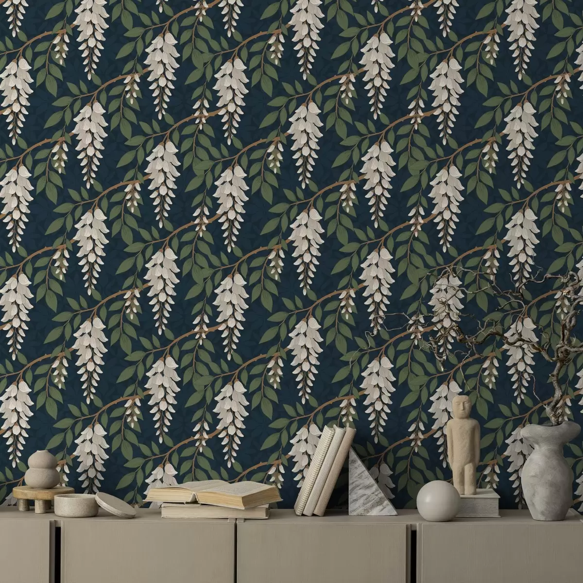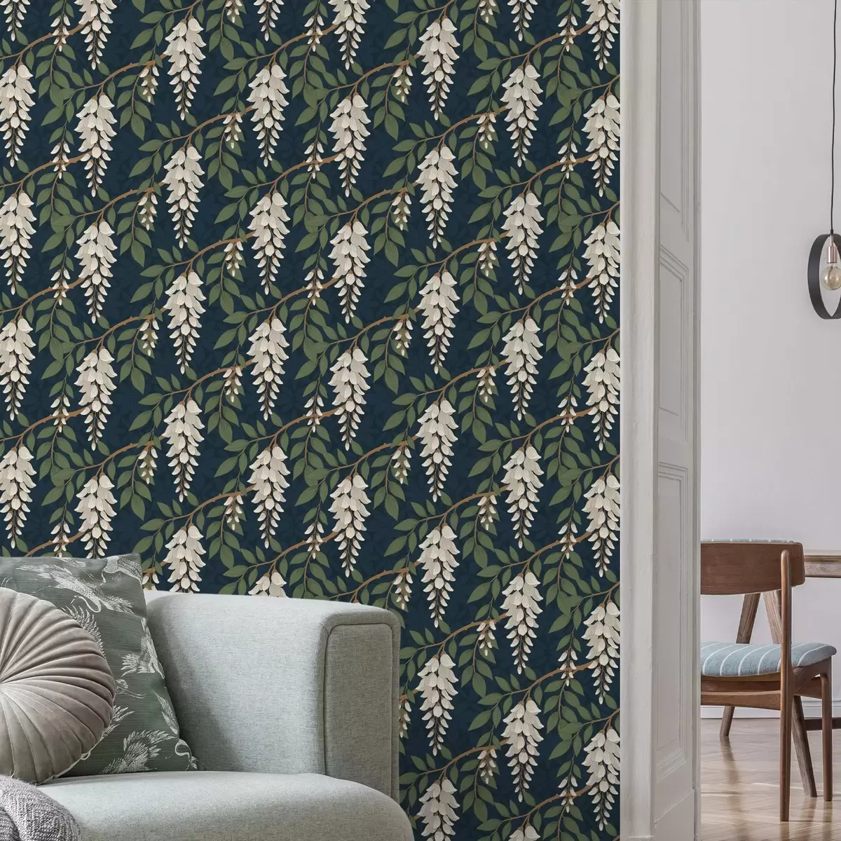 Papel pintado Glicinia marfil sobre fondo verde azulado intenso a00694v1