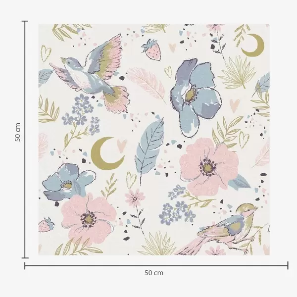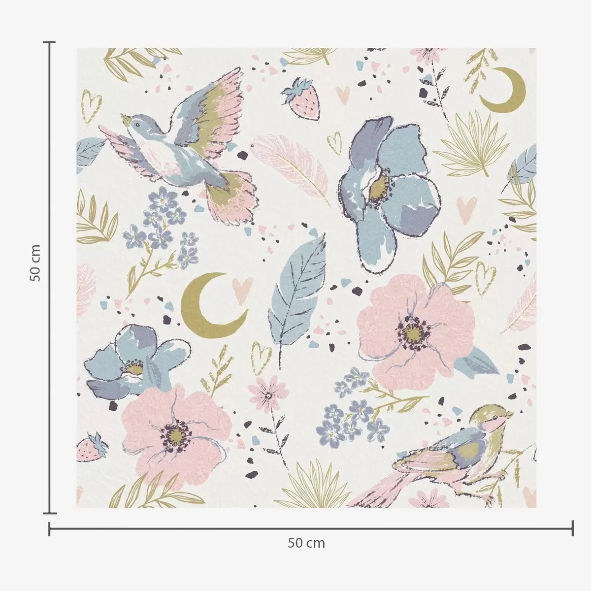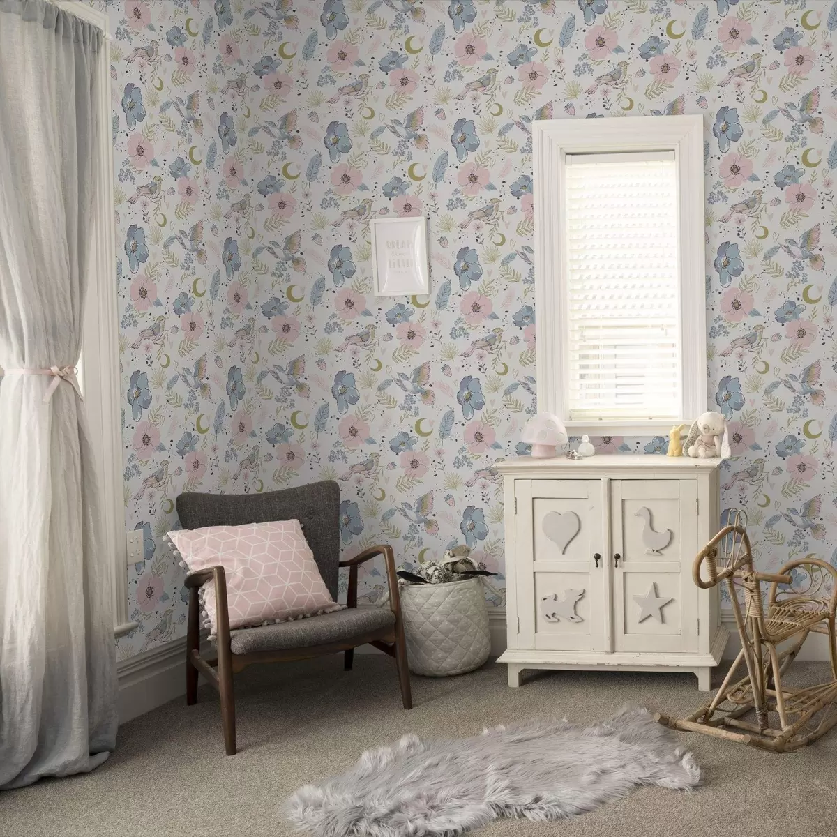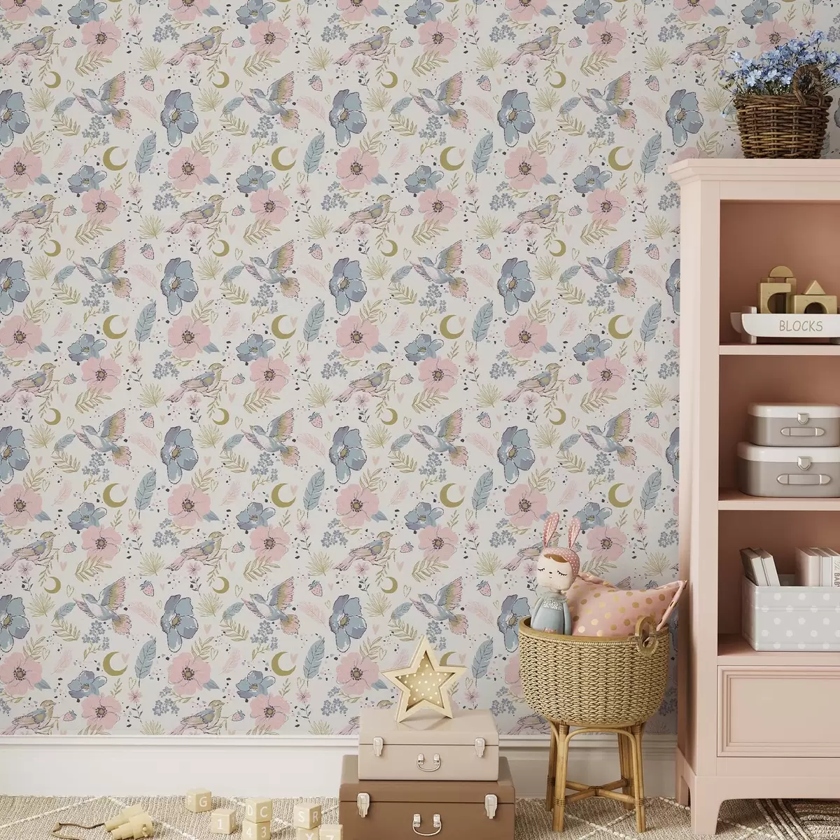 Papel pintado Aves y flores en tonos pastel con lunas crecientes sobre fondo blanco a00721