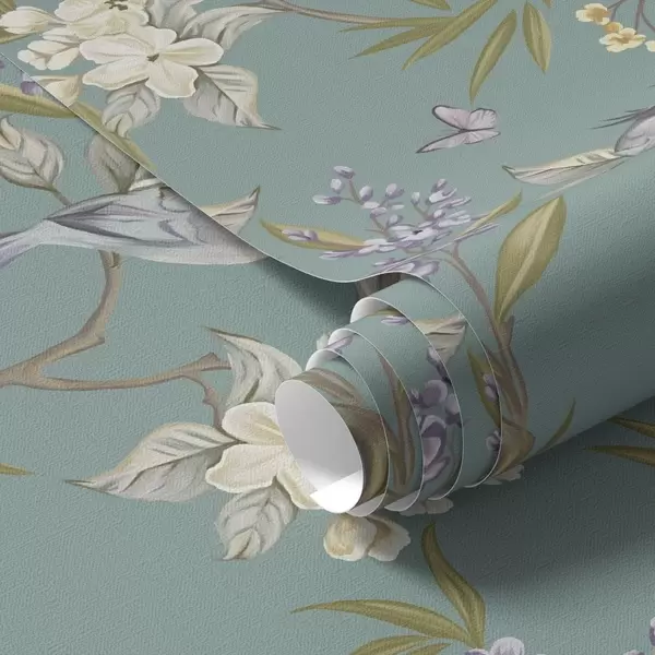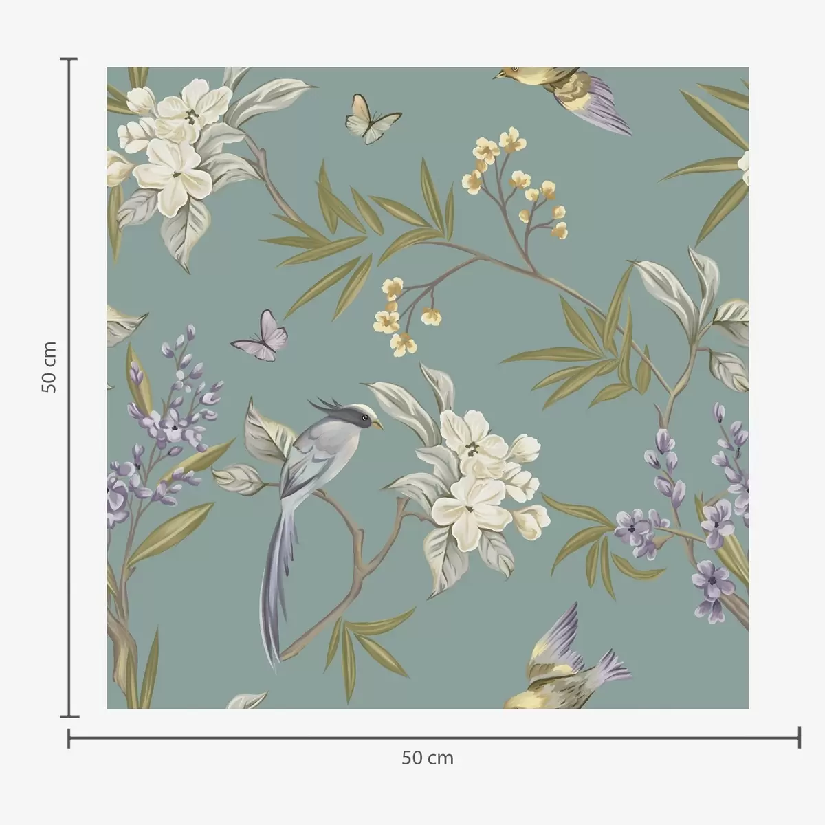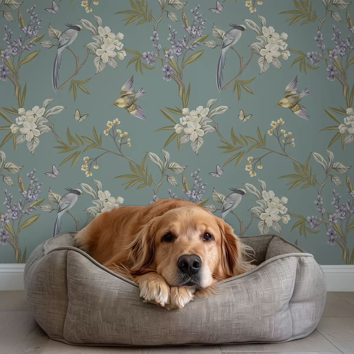 Papel pintado Pájaros, flores y mariposas sobre un fondo azul grisáceo. a00735