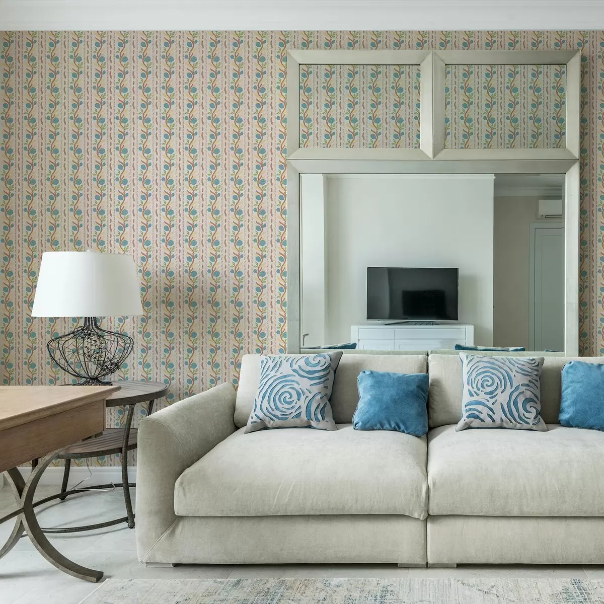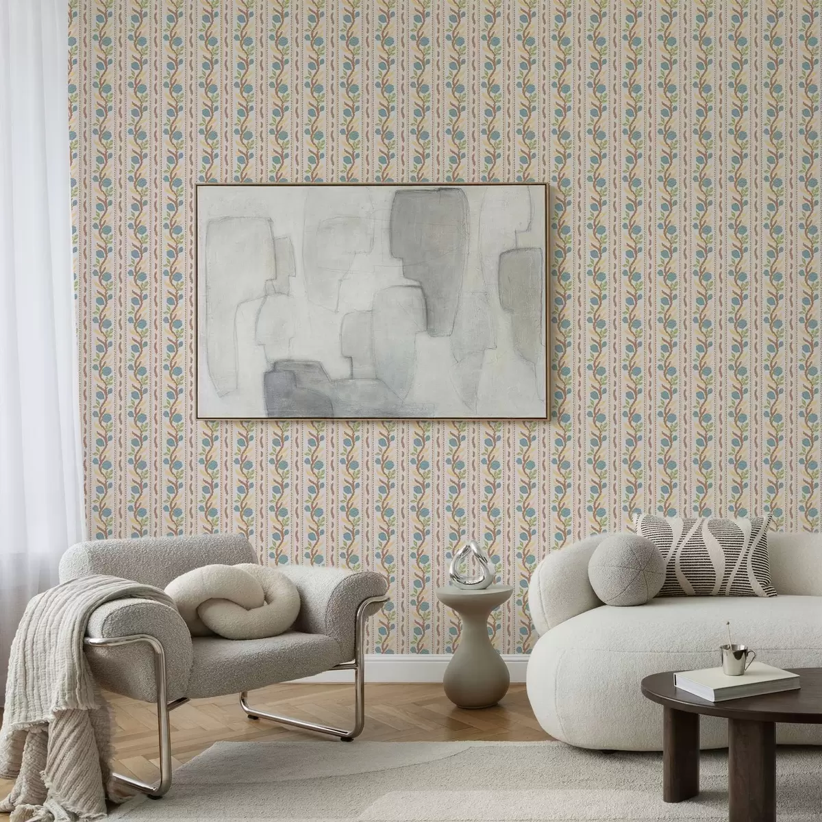 Papel pintado Rayas verticales con flores azules sobre un fondo cálido a00816v3