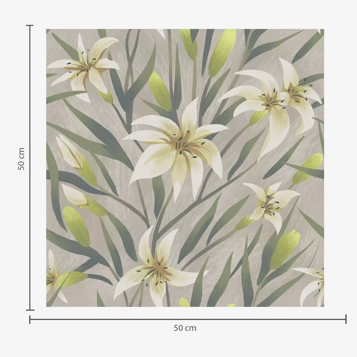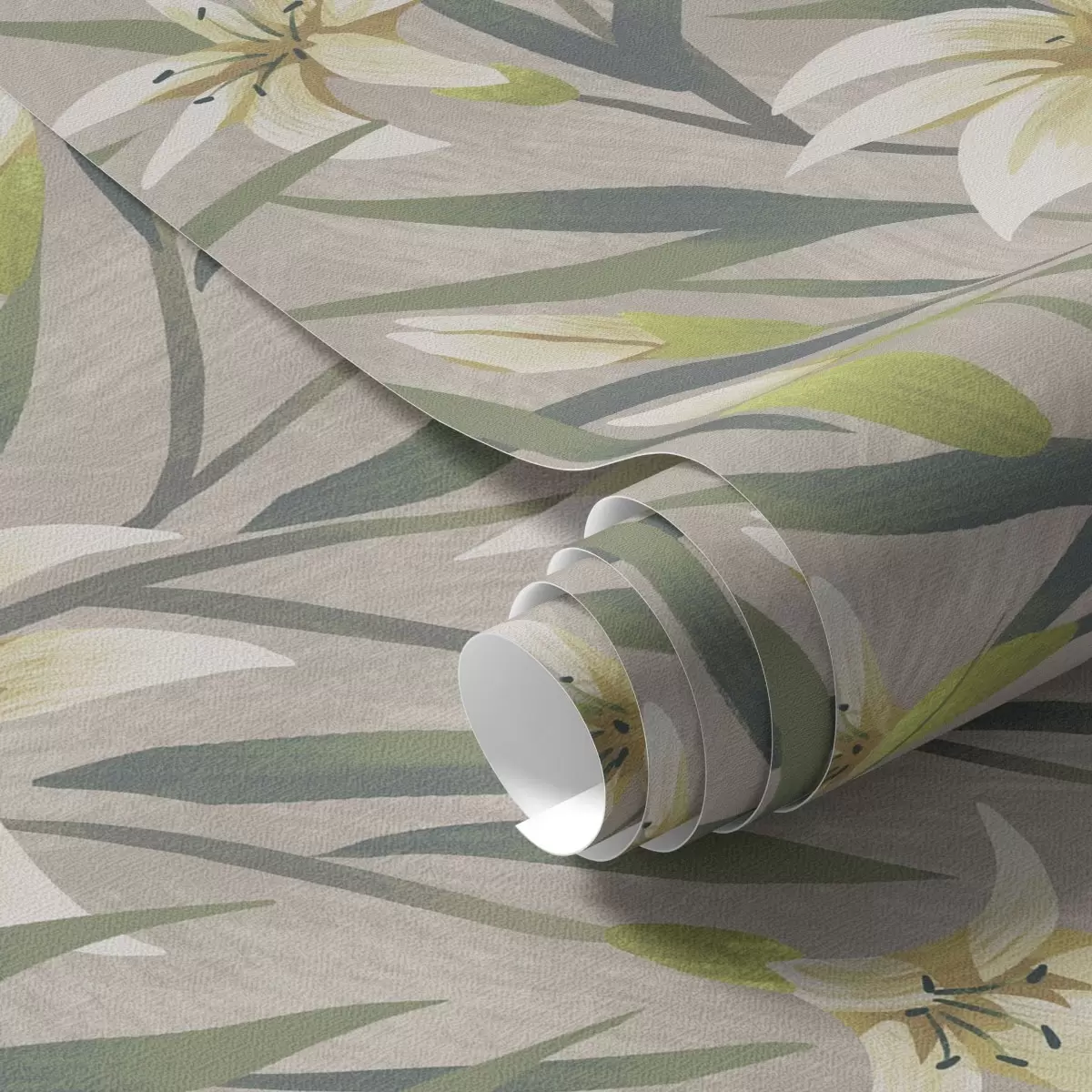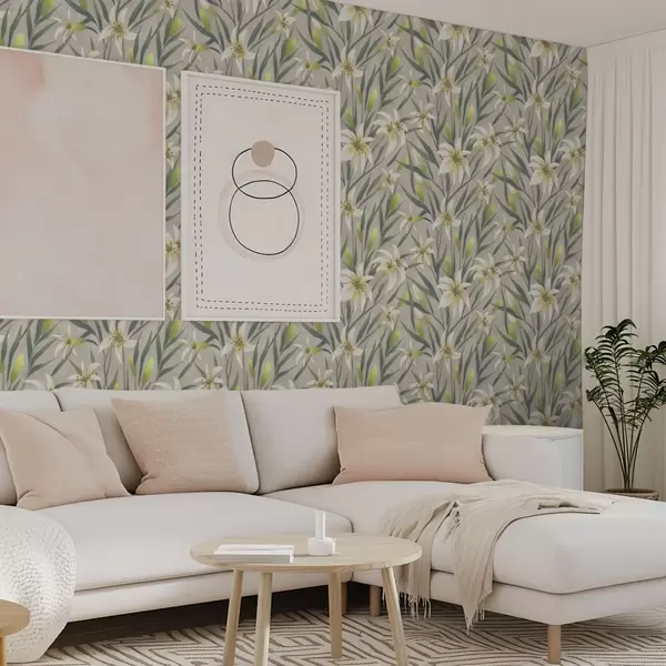 Papel pintado Lirios crema con hojas sobre fondo gris-beige a00837