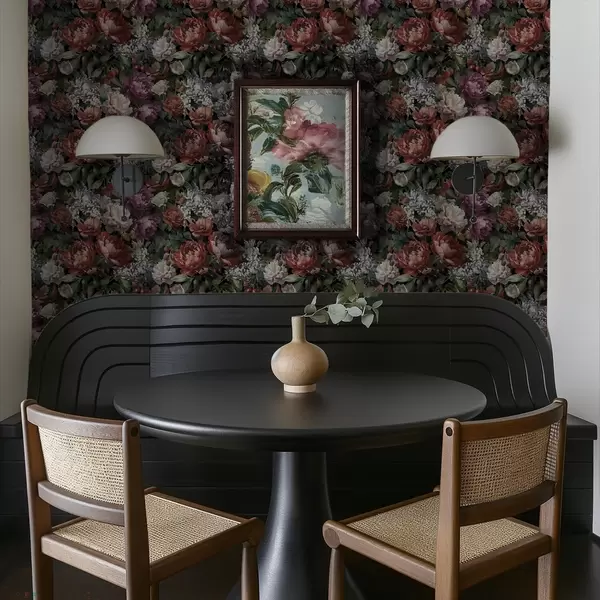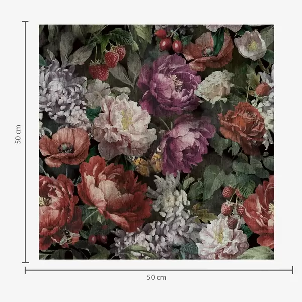 Papel pintado Peonías oscuras y dramáticas, bayas y mariposa sobre fondo negro. a00862