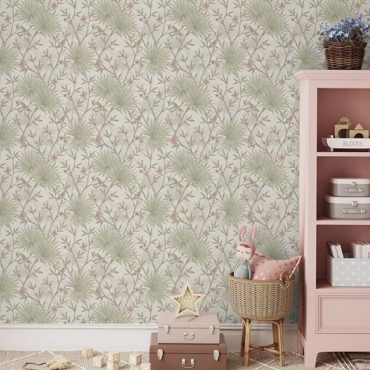 Papel pintado Delicadas aves rosadas entre hojas de palmera a00883