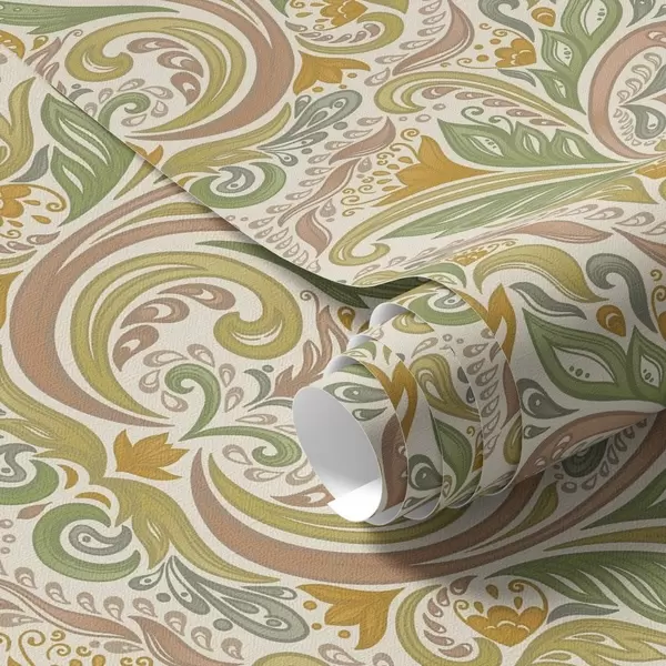 Papel pintado Remolinos ornamentales con hojas en tonos verdes y terracota. a00927v1